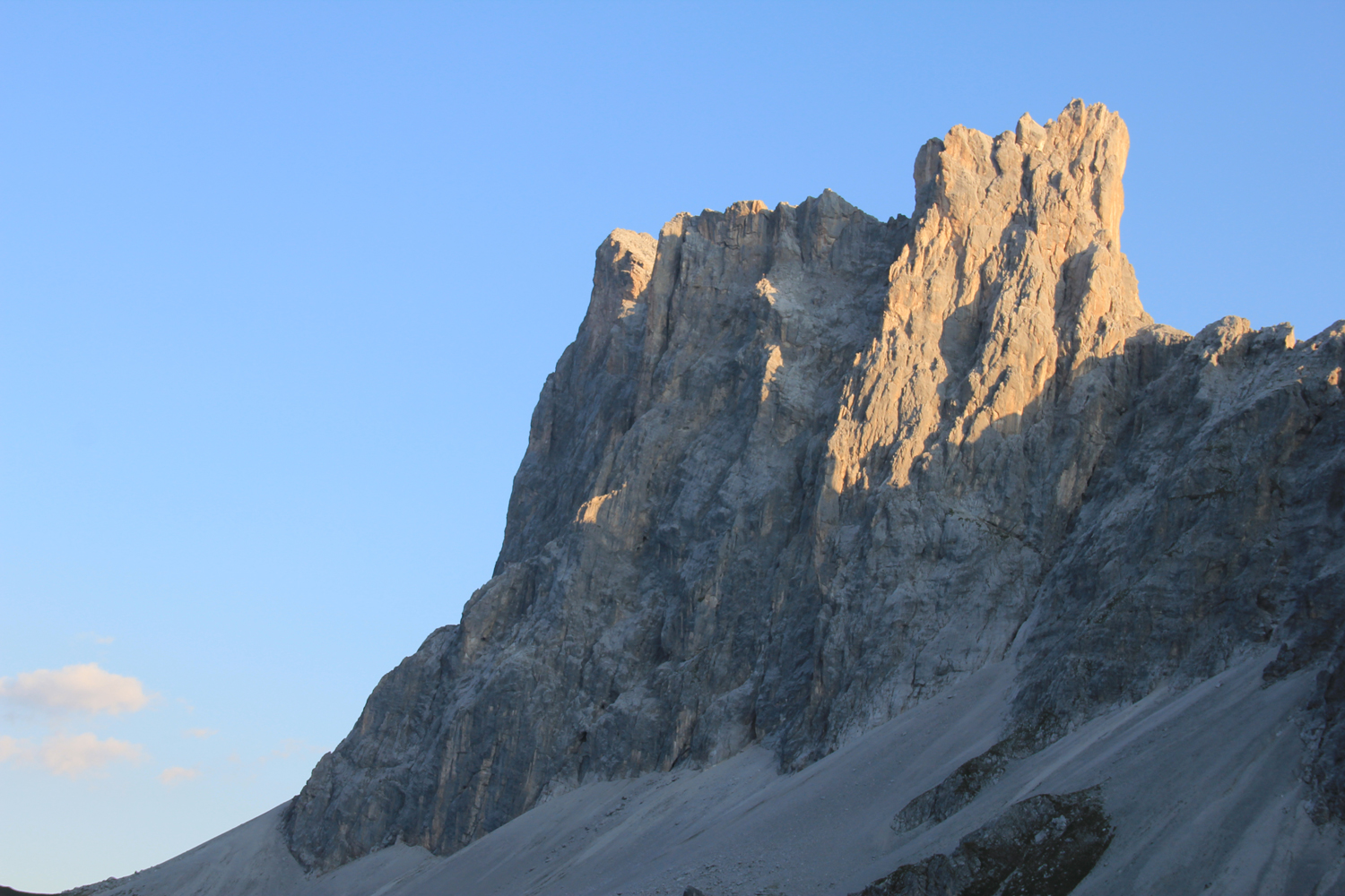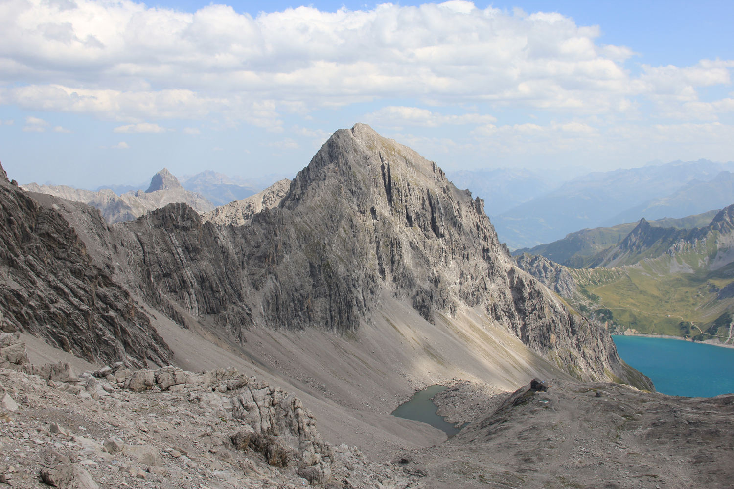 Für eine Besteigung der Schesaplana dürfte die Carschinahütte eher selten als Ausgangspunkt dienen, aber die Gelegenheit, dem höchsten Rätikon-Gipfel aufs Haupt zu steigen, ist nur zu verlockend. Die Tour beginnt – anders kann man es kaum nennen – mit einem einfachen Spaziergang, der unter den Drei Türmen und der Drusenfluh in westlicher Richtung hinüberquert. Unterhalb des Schweizertors und der Kirchlispitzen geht es weiter zum Gafalljoch, wo der unverschämt blaue Lünersee zum Greifen nahe erscheint. Hier spüre ich zum ersten Mal so richtig den heftigen Föhnsturm; ansonsten ist das Wetter fantastisch. Ich bleibe vorläufig noch auf der Südseite des Hauptkamms, bevor das Gelände erstmals anspruchsvoller wird. Ein Steig mit Geröll- und Felspassagen bringt mich zur Gamsluggen. Weiter geht es über ein weites Geröllkar, die Totalp, in Richtung Gipfel. Ein wenig Kraxelei, gesichert durch Drahtseile, ist auch dabei. Je näher ich dem Gipfelaufbau komme, desto stärker wird der Sturm. Obwohl der restliche Aufstieg ganz einfach ist, bringen mich immer wieder Windböen ein wenig aus dem Gleichgewicht. Als ich auf dem Gipfel der Schesaplana stehe, habe ich, obwohl bestimmt kein Leichtgewicht, das Bedürfnis, mich am Gipfelkreuz festzuhalten. Außer mir ist nur ein weiterer Bergwanderer in Gipfelnähe zu sehen, der aber auf die vollständige Gipfelbesteigung verzichtet. Vermutlich kommt es nicht allzu oft vor, dass man bei (prinzipiell) schönem Wetter ganz allein auf dem Schesaplana-Gipfel steht.