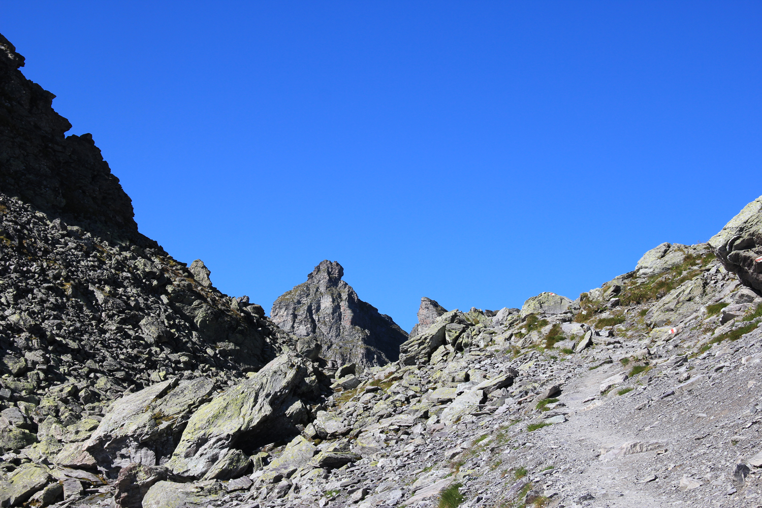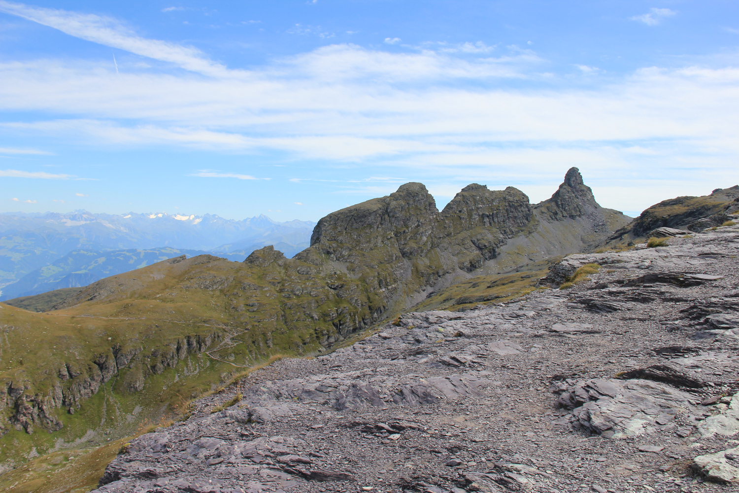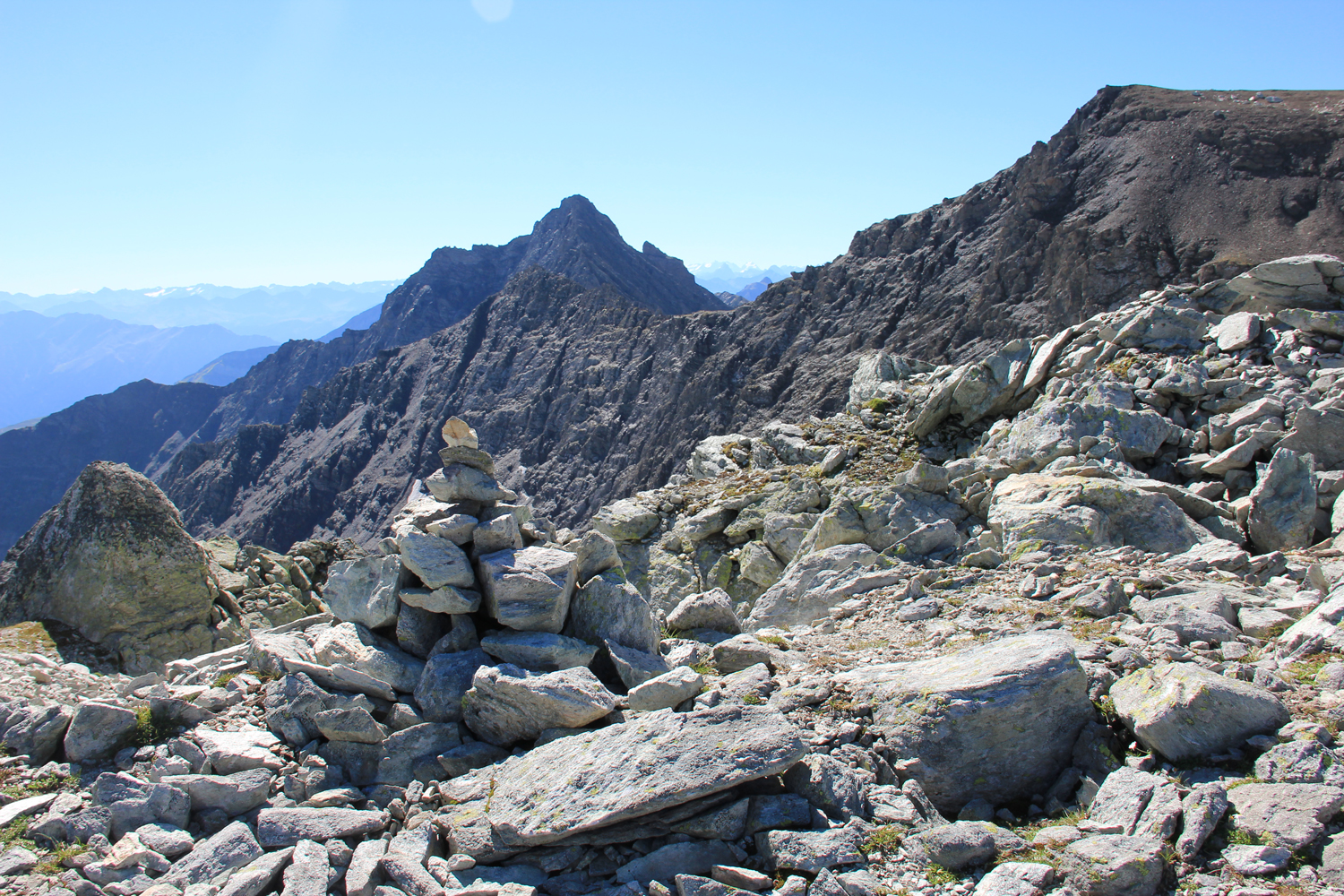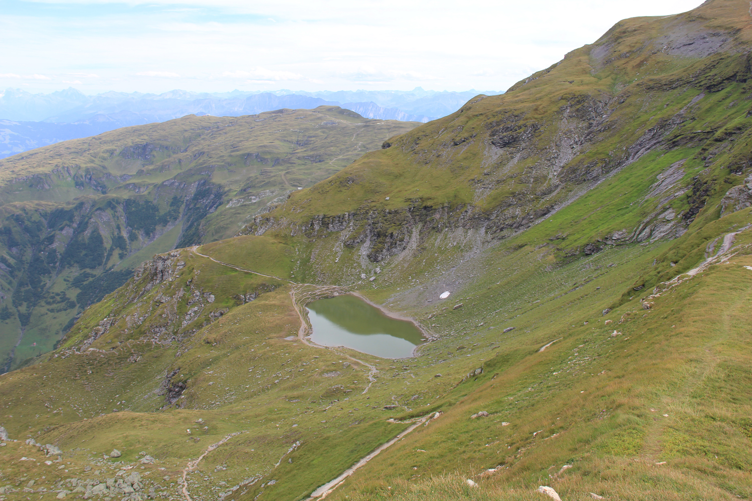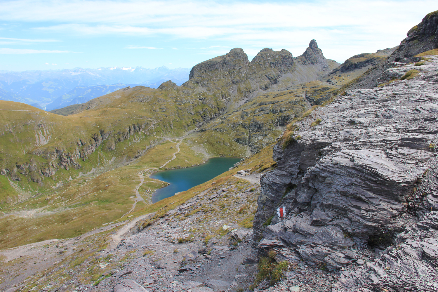 Nach einer ausgedehnten Gipfelpause steige ich auf dem gleichen Weg ab zur Wildseeluggen und zum namensgebenden Wildsee. Zum Glück ist der Betrieb nicht mehr so schlimm wie heute morgen. Ein "Stockwerk" tiefer liegt – ebenso schön wie der Wildsee – der zweite große See, der Schottensee. Nach einem Zwischenaufstieg zur Schwarzplangg geht es hinunter zum Schwarzsee, der tatsächlich eine auffallend dunkle Farbe aufweist. Vom Schwarzsee gelangt man nach einem weiteren Zwischenaufstieg zum breiten Rossstall-Rücken, der mit unzähligen Steinmännern geschmückt ist.