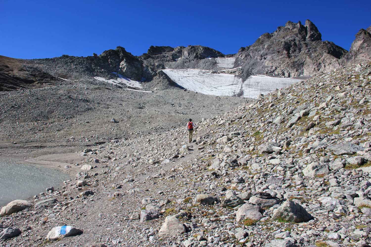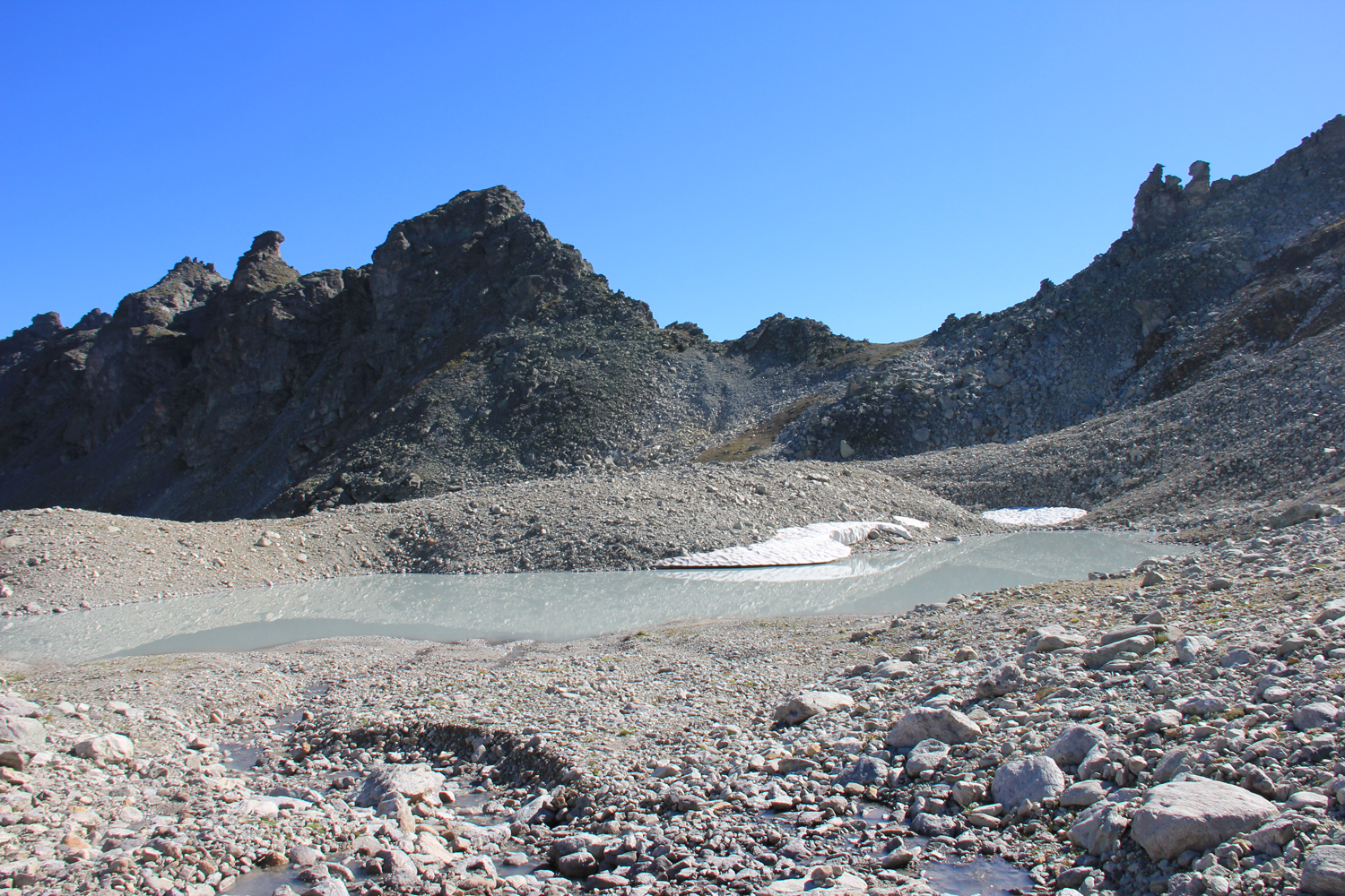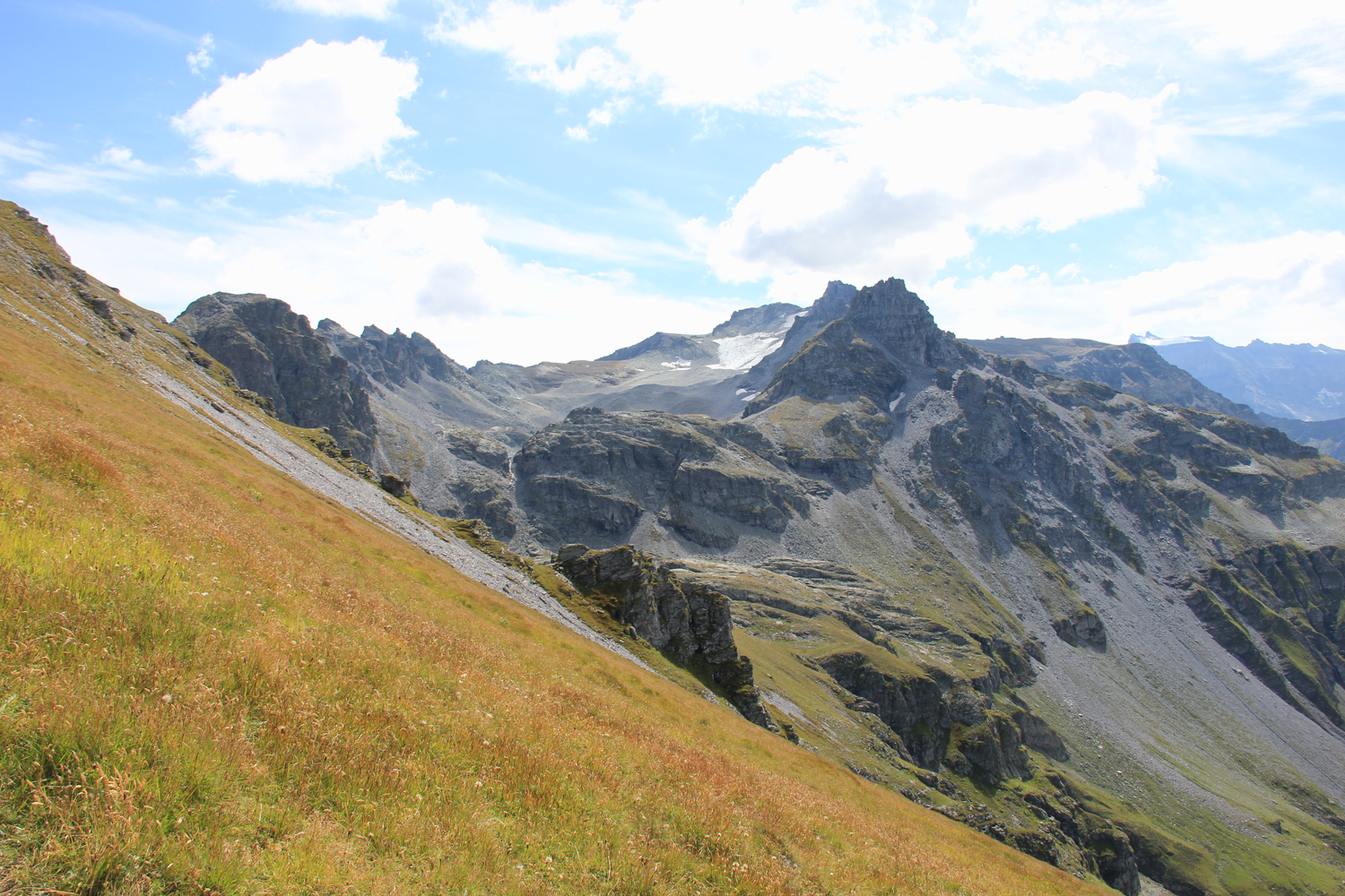 Da auch für heute eine lange Tour geplant ist, benütze ich die Seilbahn, um vom Berghotel Gaffia zurück zur Pizolhütte zu kommen. Hier herrscht enormer Betrieb. Von den vielen Bergwanderern sind die allermeisten unterwegs zur berühmten Fünf-Seen-Wanderung, nur wenige haben wie ich vor, den Pizol-Gipfel anzupacken. Daher wird es nach der Wildseeluggen bedeutend ruhiger. Über Moränengelände geht es auf die Reste des Pizolgletschers zu. Wegen Steinschlaggefahr wurde die Wegführung geändert; man geht nicht mehr über den Gletscher zur Gipfelscharte, sondern steigt in einfacher Kletterei (I, Drahtseilsicherungen) durch die Felsen östlich des Gletschers auf. Von der Scharte ist der Pizol-Gipfel leicht zu erreichen. Die Aussicht, unter anderem auf die Bernina-Gruppe, ist überwältigend.