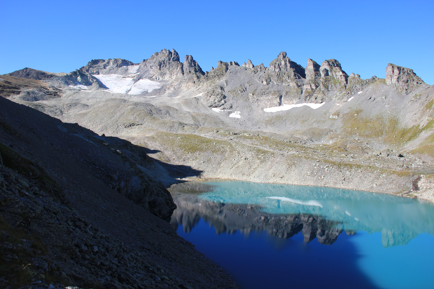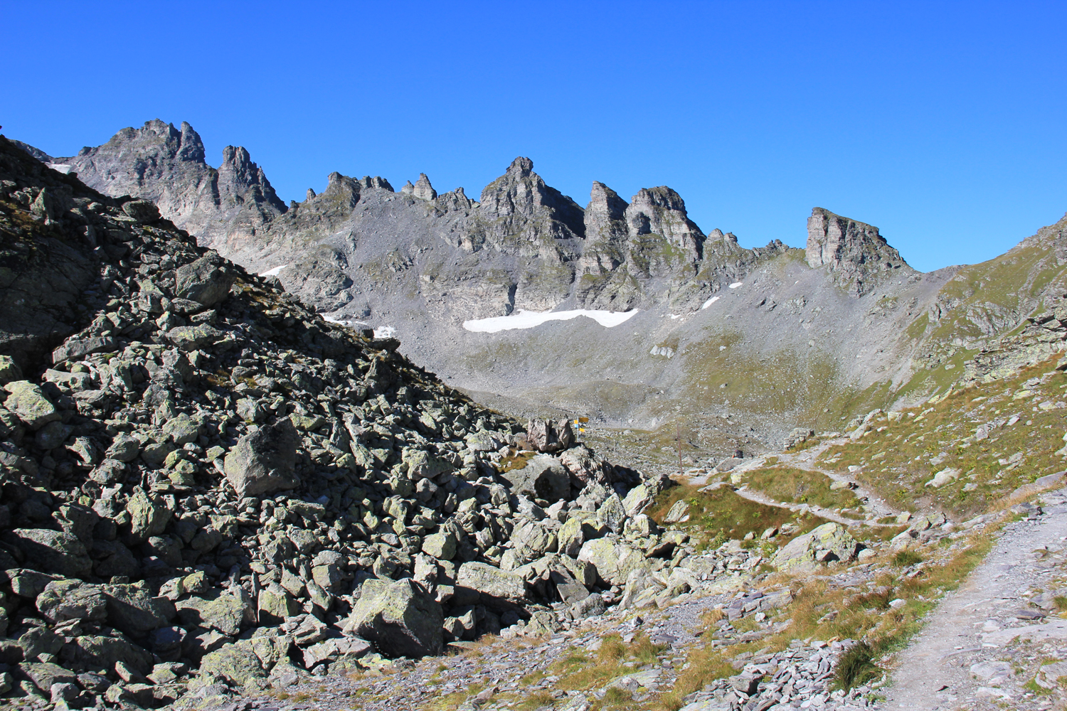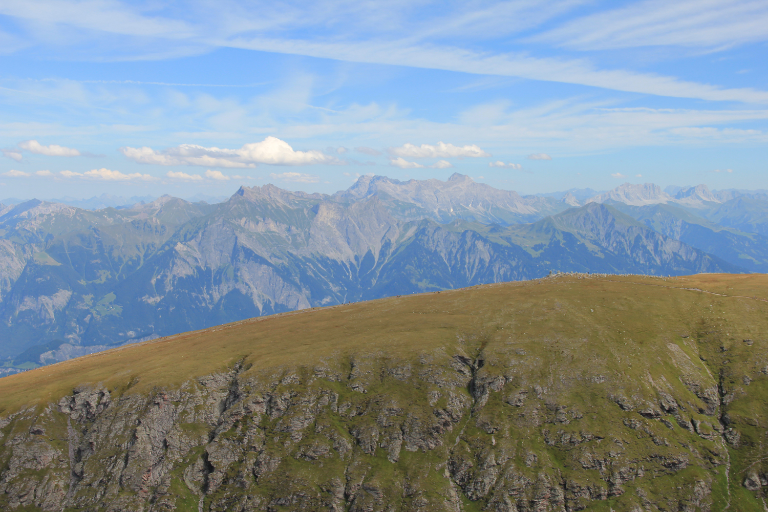 Da auch für heute eine lange Tour geplant ist, benütze ich die Seilbahn, um vom Berghotel Gaffia zurück zur Pizolhütte zu kommen. Hier herrscht enormer Betrieb. Von den vielen Bergwanderern sind die allermeisten unterwegs zur berühmten Fünf-Seen-Wanderung, nur wenige haben wie ich vor, den Pizol-Gipfel anzupacken. Daher wird es nach der Wildseeluggen bedeutend ruhiger. Über Moränengelände geht es auf die Reste des Pizolgletschers zu. Wegen Steinschlaggefahr wurde die Wegführung geändert; man geht nicht mehr über den Gletscher zur Gipfelscharte, sondern steigt in einfacher Kletterei (I, Drahtseilsicherungen) durch die Felsen östlich des Gletschers auf. Von der Scharte ist der Pizol-Gipfel leicht zu erreichen. Die Aussicht, unter anderem auf die Bernina-Gruppe, ist überwältigend.