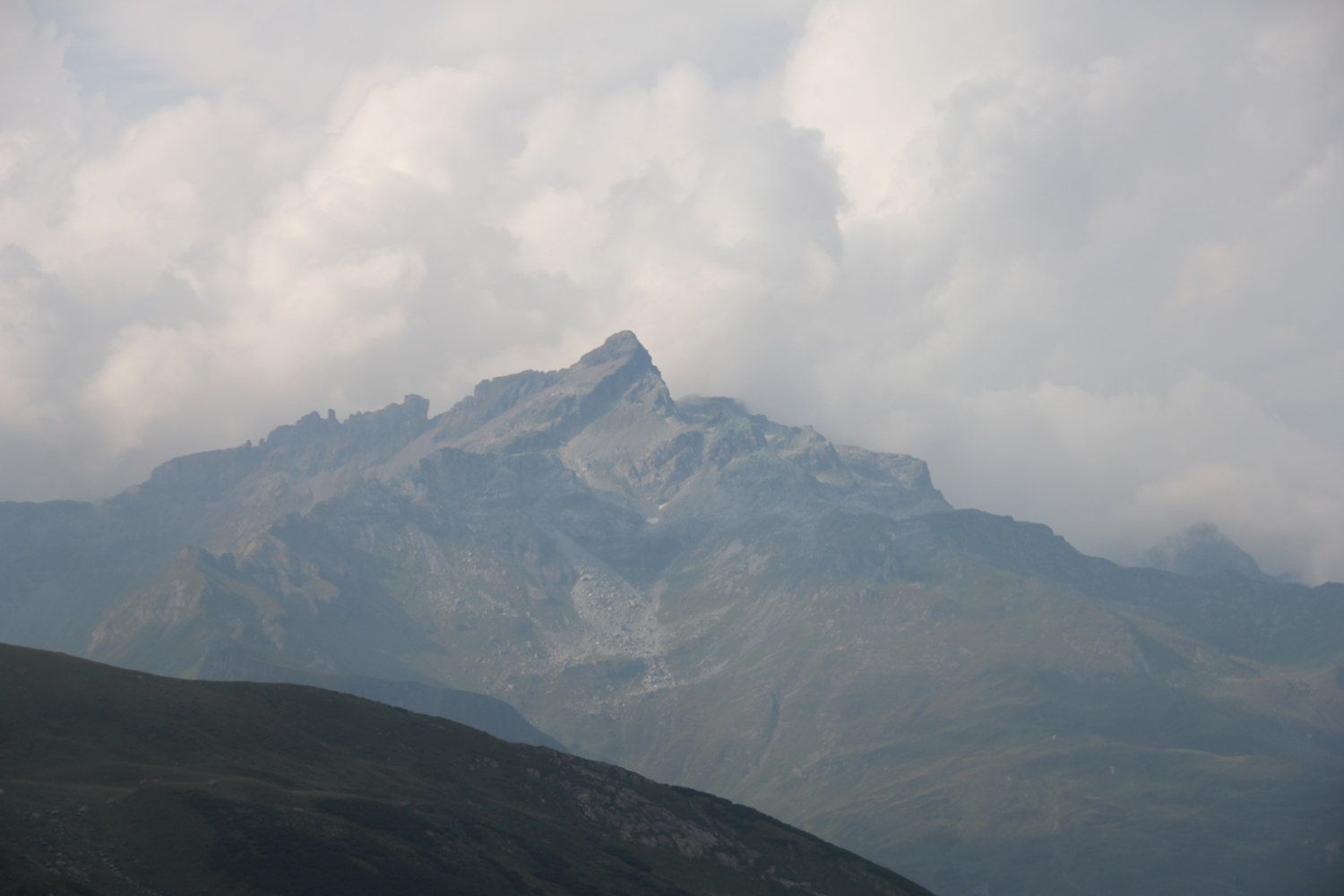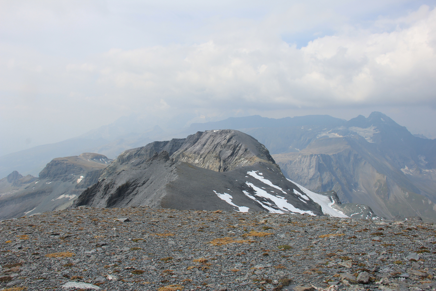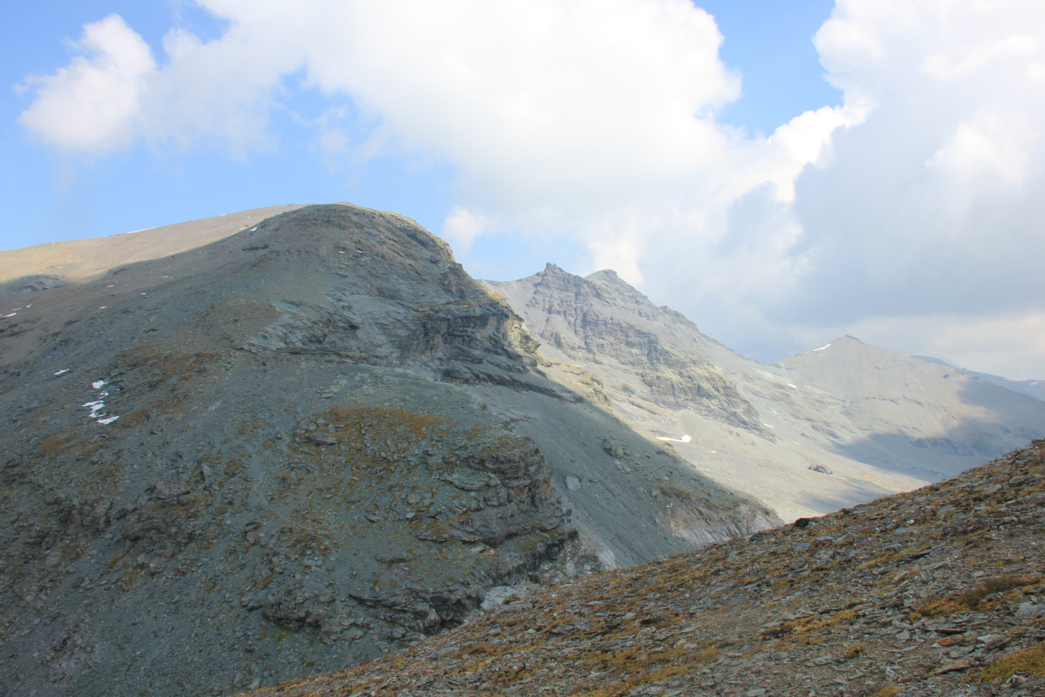Der Abstieg erfolgt über einen langen Kamm, der sich allmählich nach Südwesten absenkt. Die Wanderung ist lange Zeit einfach, dann allerdings wird das Gelände immer schwieriger. Ich sehe mich gezwungen, etwa 50 Höhenmeter zurückzusteigen, bis es einen einfachen Übergang in den flacheren, aber von vielen Felsblöcken übersäten Geröllhang gibt. Eigentlich müsste es hier Steigspuren geben, aber ich finde keine. (Offensichtlich hätte ich mich vorher besser informieren sollen.) Mehr als eine Stunde quere ich diesen unangenehm zu begehenden Hang, erst dann stoße ich auf einen Steig, der über eine kleine Scharte hinunter zum Panixerpass führt.
