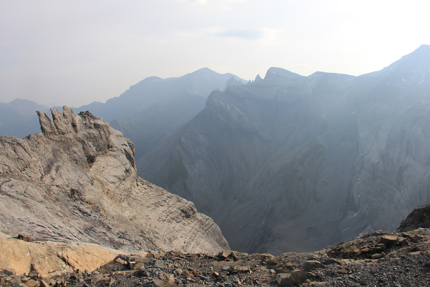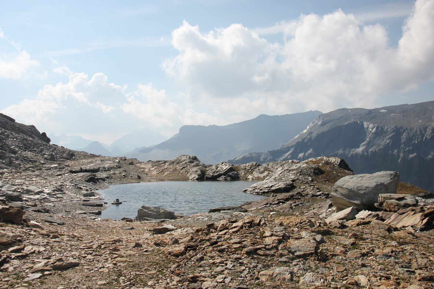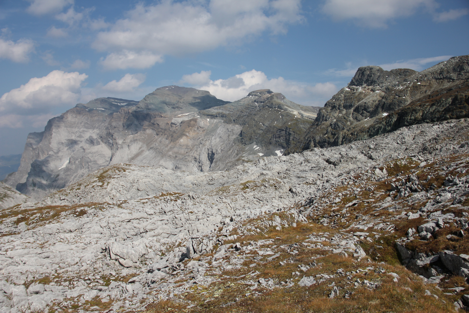 Der Abstieg erfolgt über einen langen Kamm, der sich allmählich nach Südwesten absenkt. Die Wanderung ist lange Zeit einfach, dann allerdings wird das Gelände immer schwieriger. Ich sehe mich gezwungen, etwa 50 Höhenmeter zurückzusteigen, bis es einen einfachen Übergang in den flacheren, aber von vielen Felsblöcken übersäten Geröllhang gibt. Eigentlich müsste es hier Steigspuren geben, aber ich finde keine. (Offensichtlich hätte ich mich vorher besser informieren sollen.) Mehr als eine Stunde quere ich diesen unangenehm zu begehenden Hang, erst dann stoße ich auf einen Steig, der über eine kleine Scharte hinunter zum Panixerpass führt.