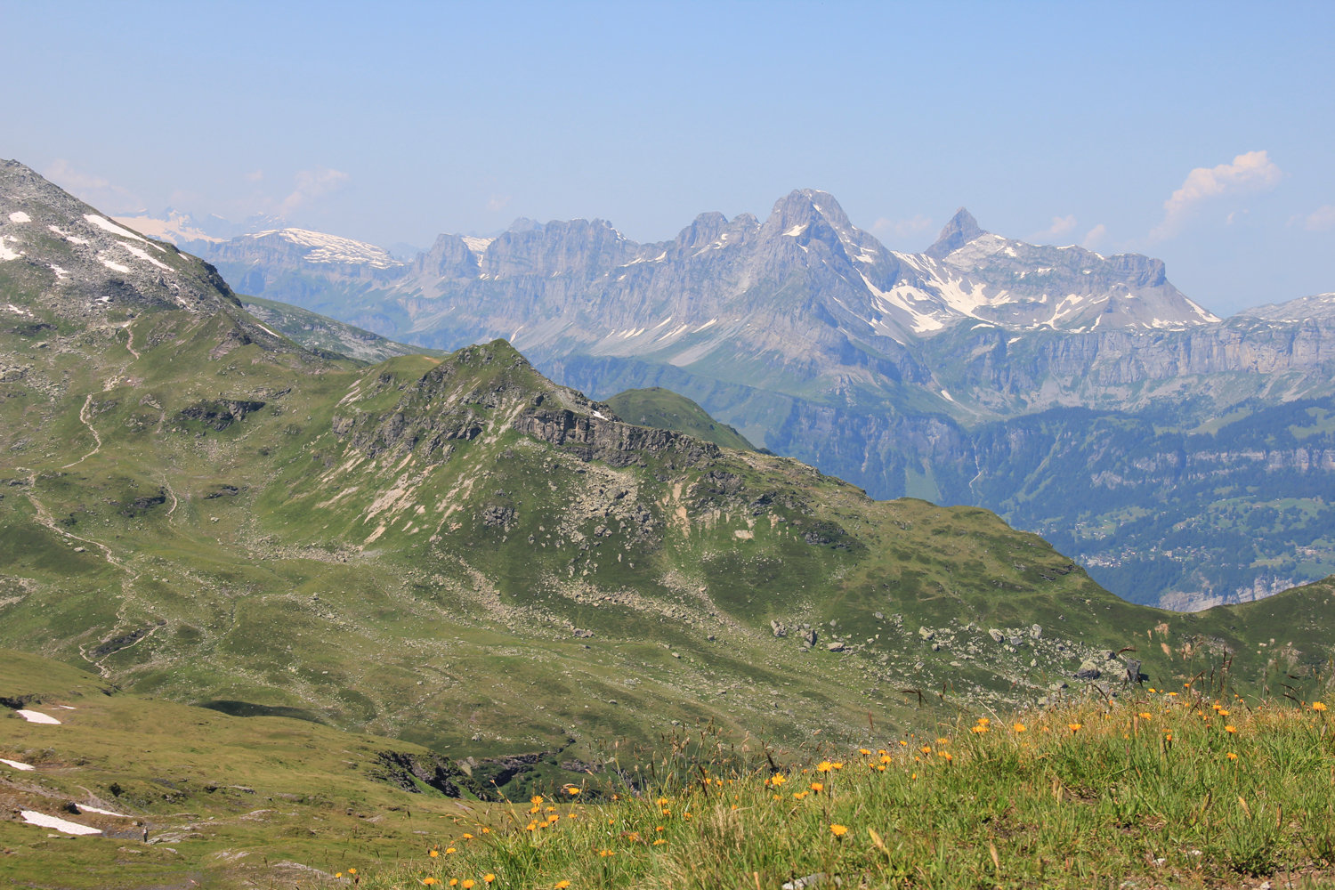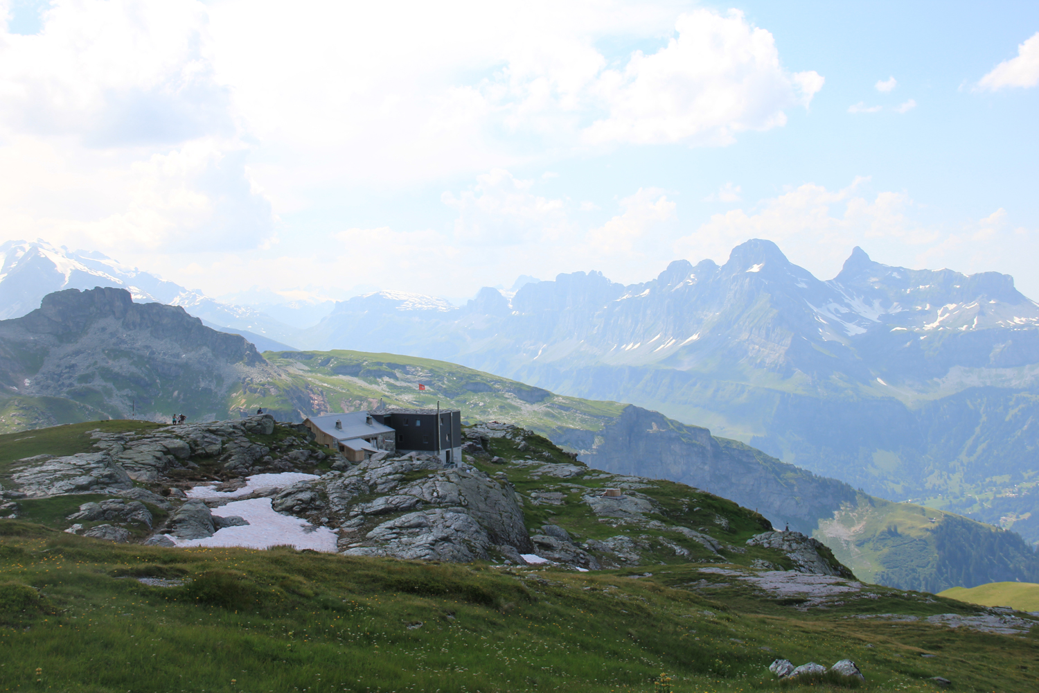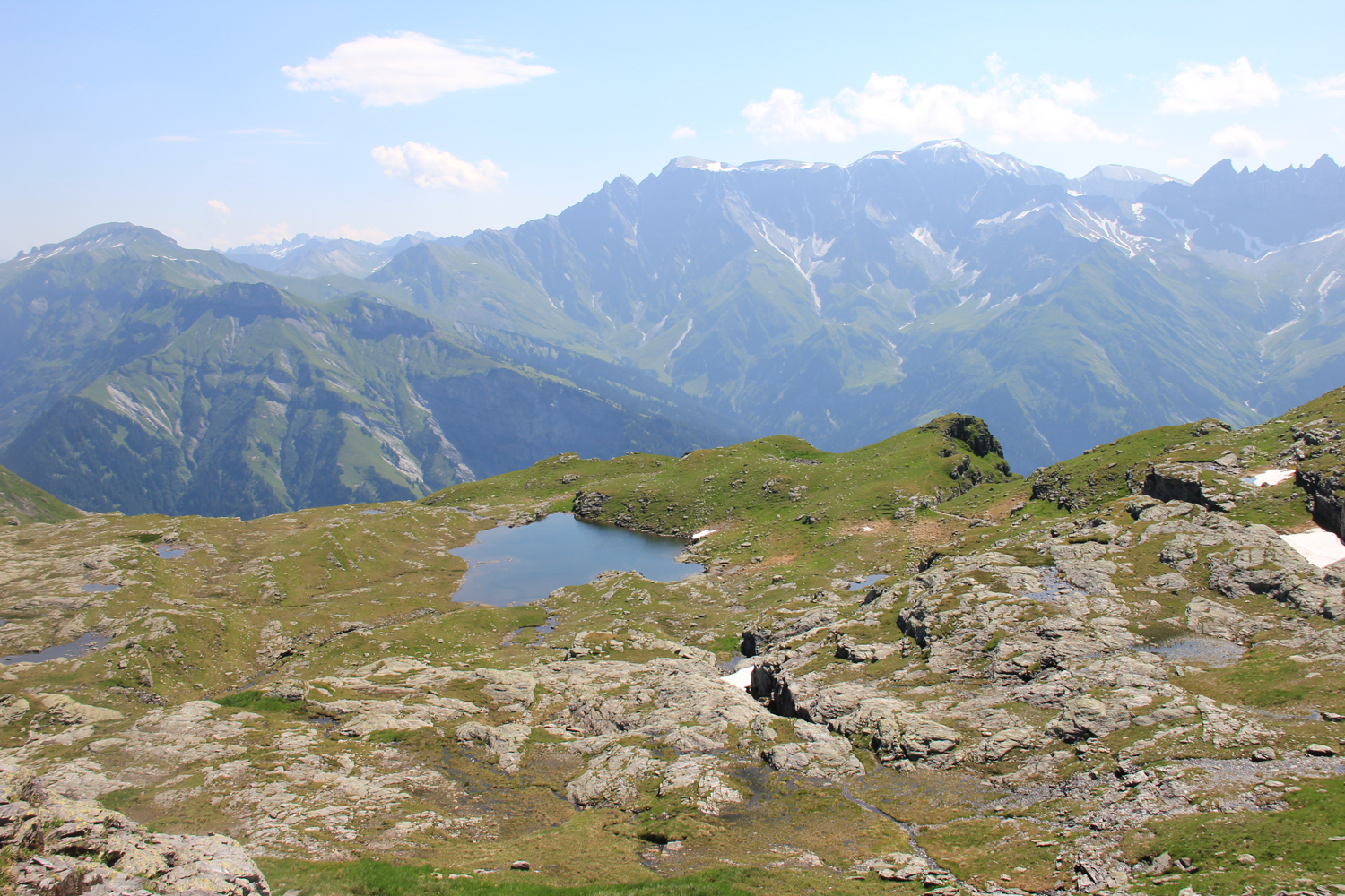 Bei schönstem Wetter – noch sind die Temperaturen erträglich – starte ich im Dorf Elm und steige auf problemlosen Wanderwegen zum Ampächli auf, das man auch mithilfe einer Seilbahn erreichen könnte. Besonders die Segnas-Gruppe, das Martinsloch und der Hausstock ziehen die Blicke auf sich. Auch der Weiterweg zum höchsten Punkt der Tagestour, dem Wildmadfurggeli, ist einfach und aussichtsreich. Es geht vorbei am idyllischen Chüebodensee und an einem kleineren See, bis schließlich die Scharte erreicht ist. Als neues Highlight setzt sich hier das Glärnisch-Massiv in Szene. Der Weiterweg führt etwa 200 Höhenmeter abwärts, bis von rechts (Norden) der Weg vom Garichti-Stausee einmündet. Anschließend geht es wieder aufwärts zum Sunnenbergfurggele, von dem es nur noch ein Katzensprung bis zur Leglerhütte ist.