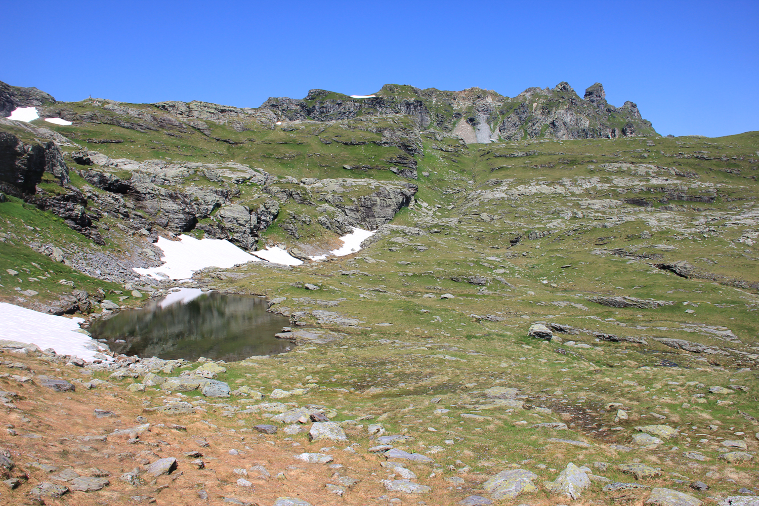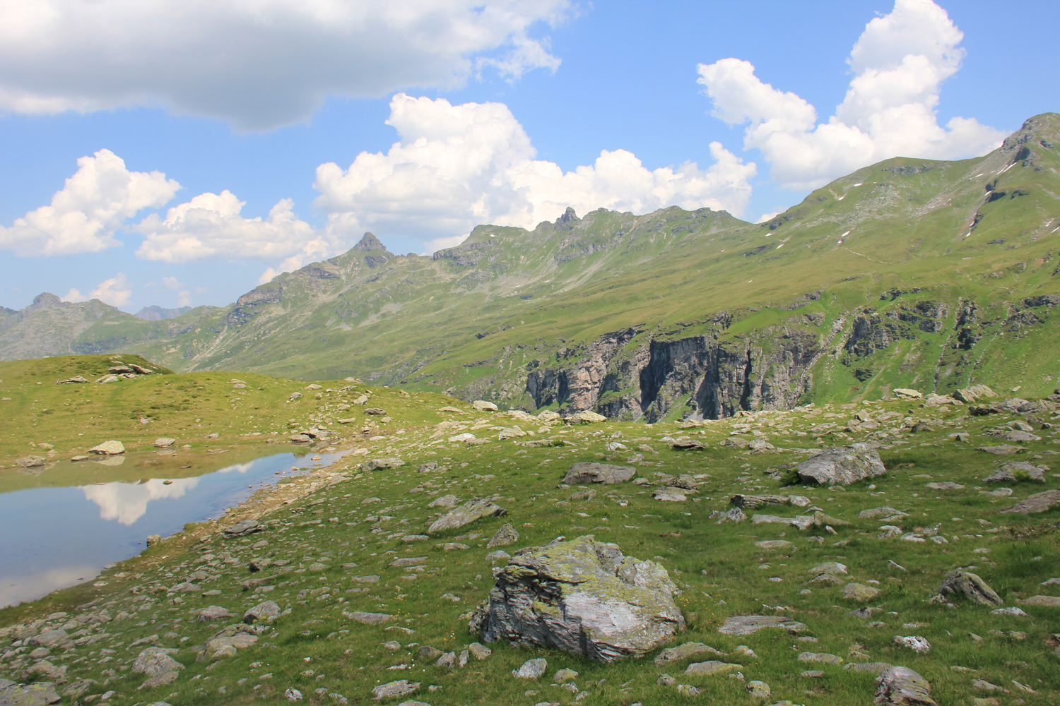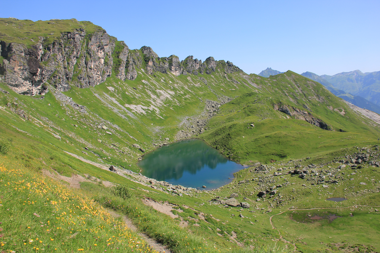 Bei schönstem Wetter – noch sind die Temperaturen erträglich – starte ich im Dorf Elm und steige auf problemlosen Wanderwegen zum Ampächli auf, das man auch mithilfe einer Seilbahn erreichen könnte. Besonders die Segnas-Gruppe, das Martinsloch und der Hausstock ziehen die Blicke auf sich. Auch der Weiterweg zum höchsten Punkt der Tagestour, dem Wildmadfurggeli, ist einfach und aussichtsreich. Es geht vorbei am idyllischen Chüebodensee und an einem kleineren See, bis schließlich die Scharte erreicht ist. Als neues Highlight setzt sich hier das Glärnisch-Massiv in Szene. Der Weiterweg führt etwa 200 Höhenmeter abwärts, bis von rechts (Norden) der Weg vom Garichti-Stausee einmündet. Anschließend geht es wieder aufwärts zum Sunnenbergfurggele, von dem es nur noch ein Katzensprung bis zur Leglerhütte ist.