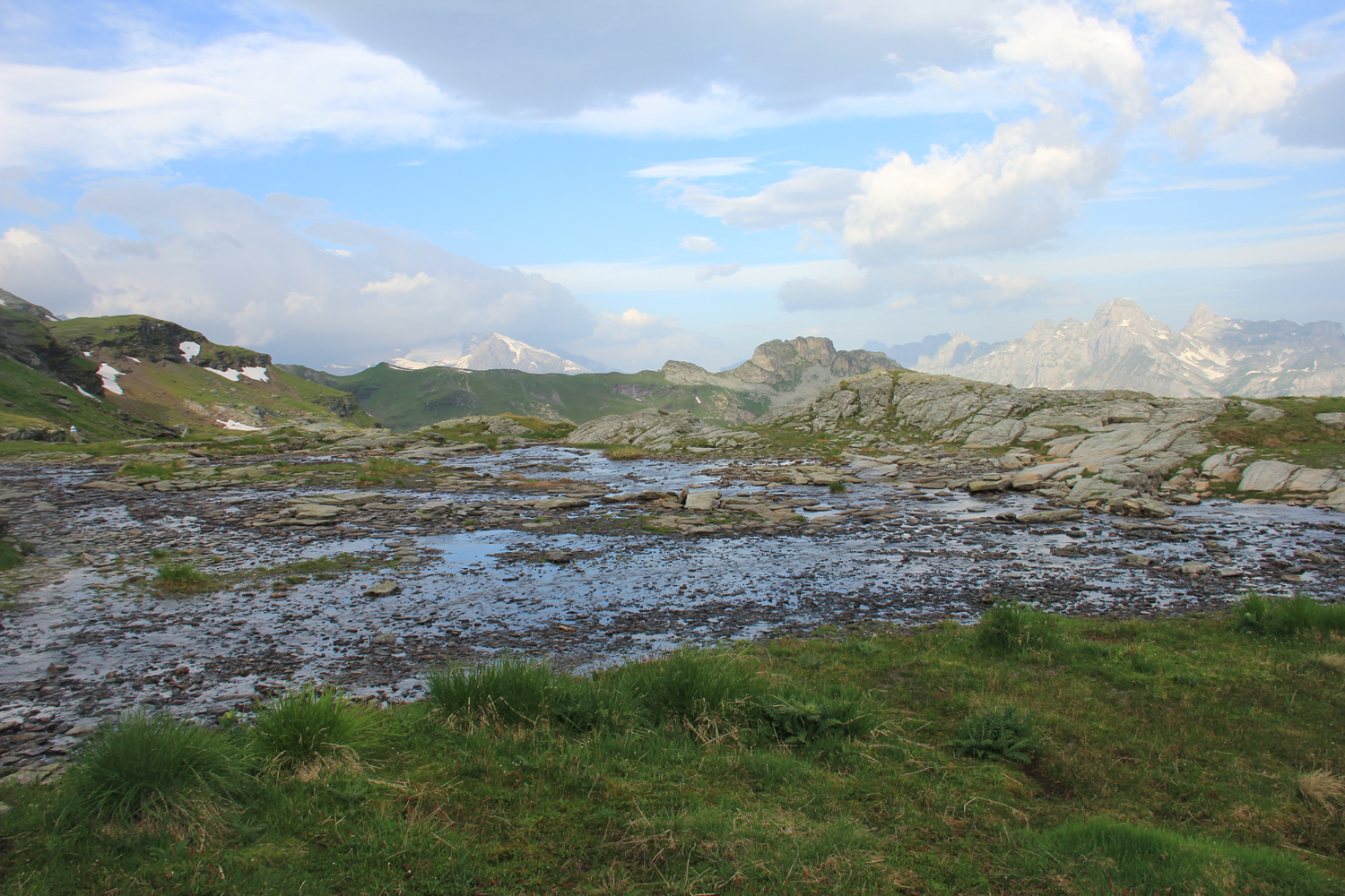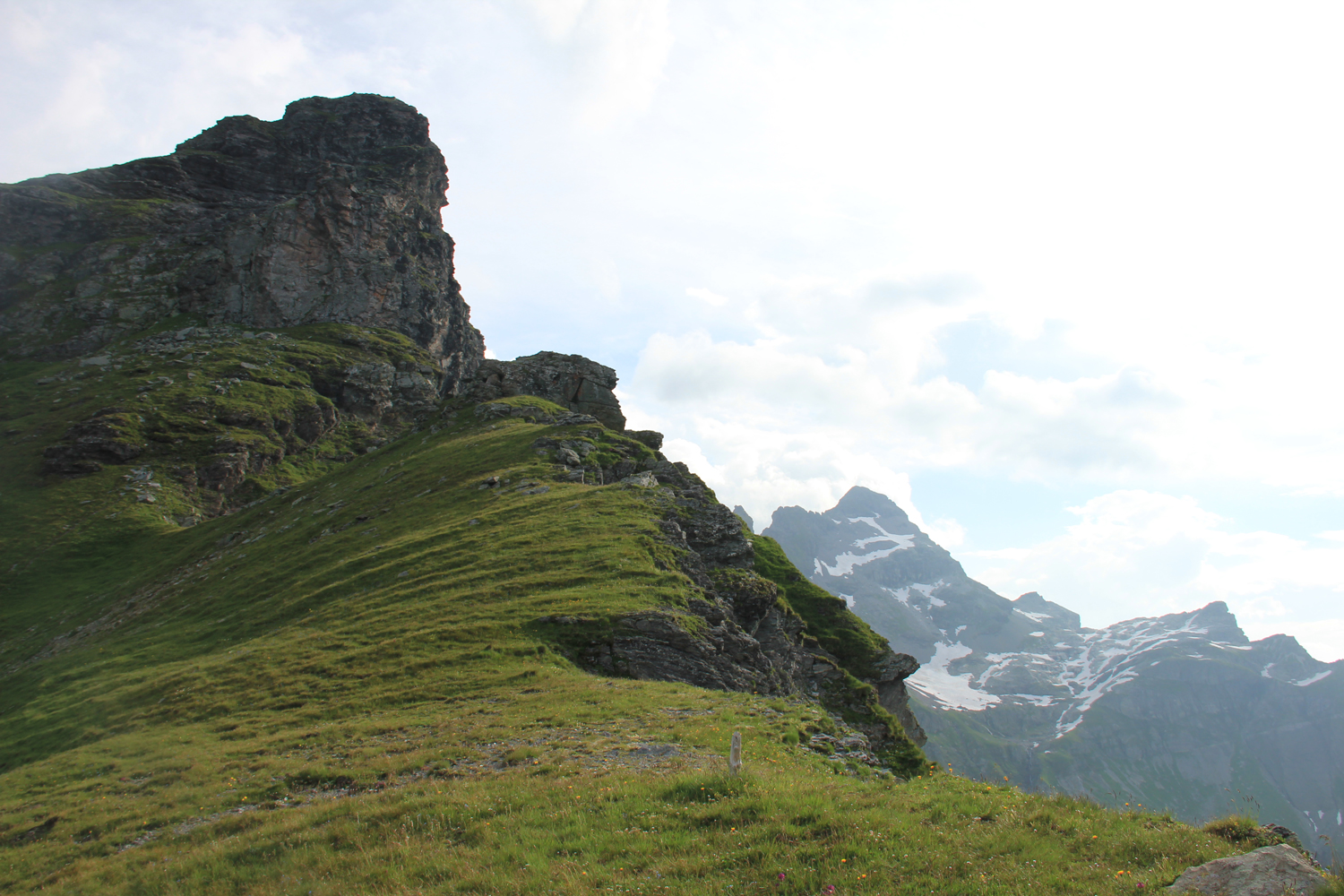 Der Weg passiert schon bald nach der Leglerhütte den schön gelegenen Milchspüelersee. Danach geht es über angenehm zu begehende Grashänge zu einem kleinen Sattel westlich unter dem Hanenstock. Im Nordwesten beherrscht das Glärnisch-Massiv die Szene, auch Ortstock und Höch Turm sind gut zu sehen. Der Blick in Richtung Tödi ist dagegen durch Wolken eingeschränkt. Ein einfacher grasiger Aufstieg bringt mich zum höchsten Punkt der heutigen Tour, dem Chalchstöckli. Wegen der starken Windböen verlasse ich den Gipfel schnell wieder, um zum Richetlipass abzusteigen. In diesem Bereich ist der Weg etwas anspruchsvoller als bisher, übersteigt aber kaum die Schwierigkeitsstufe T3.