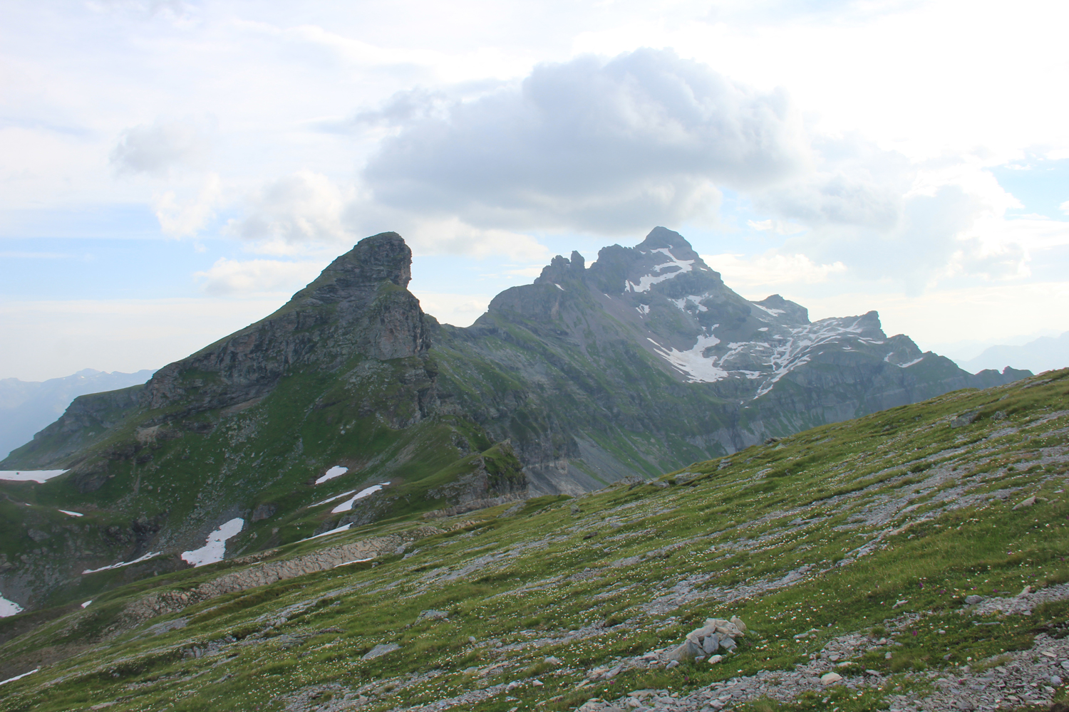 Die heutige Etappe meiner Weitwanderung besteht aus einer Querung von der Leglerhütte zum Richetlipass (unter Mitnahme des Chalchstöckli-Gipfels) und einem langen Talabstieg ins tief gelegene Linthal. Das Wetter ist nicht mehr ganz so hochsommerlich wie gestern, aber nach wie vor ganz ordentlich. Nur der starke Wind stört ein wenig.