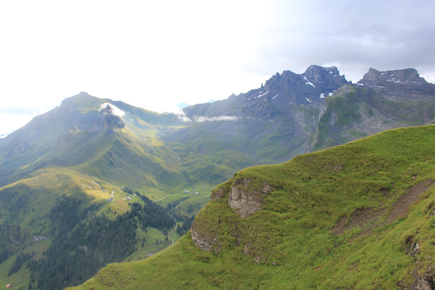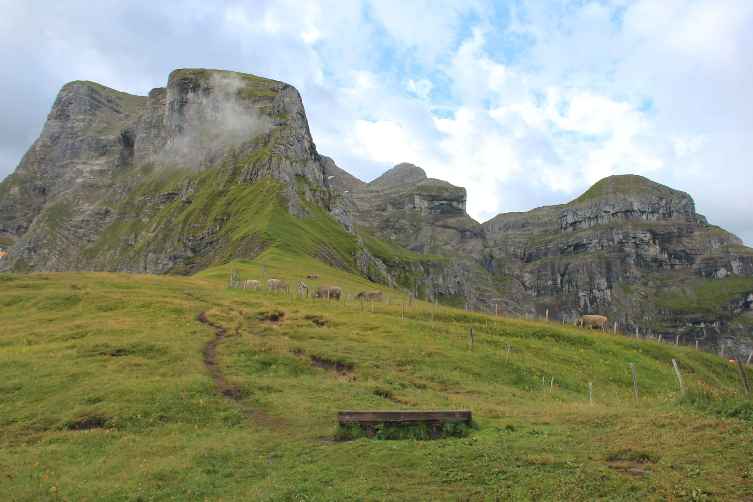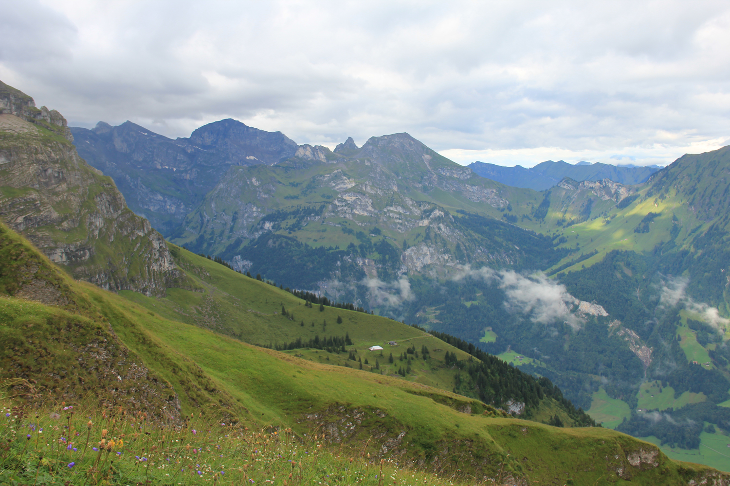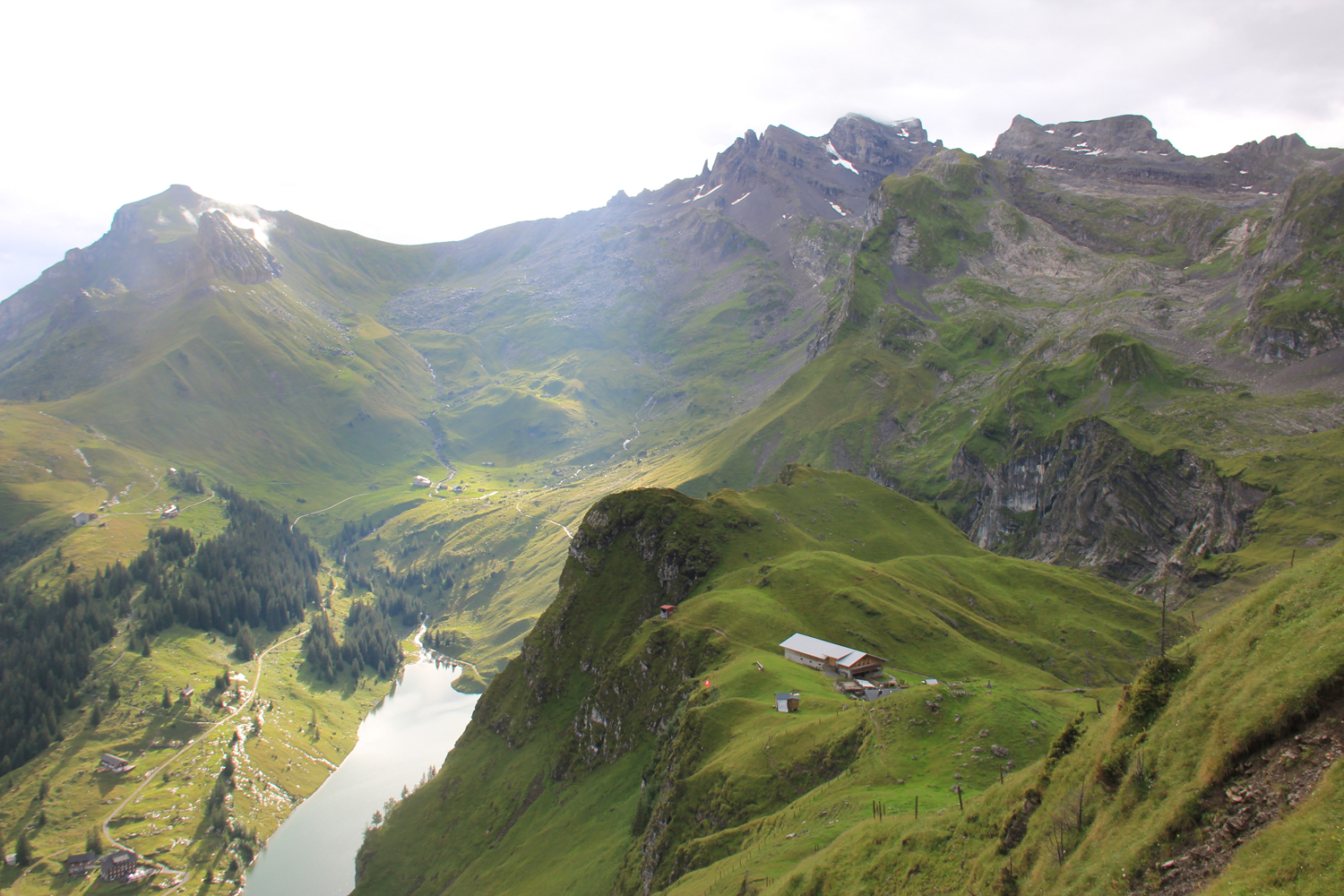 Auf der anderen Seite des Sattels geht es hinunter zur Walenalp, bevor der Weg bei der Querung unter den Walenstöcken wieder etwas Höhe gewinnt. Über einen weiteren Sattel (Rosenbold) wandere ich fast waagrecht hinüber zur Brunnihütte. Vorbei an Rigidalstafel und Ristis, steige ich ab nach Engelberg, das mich sogar mit ein wenig Sonnenschein begrüßt.