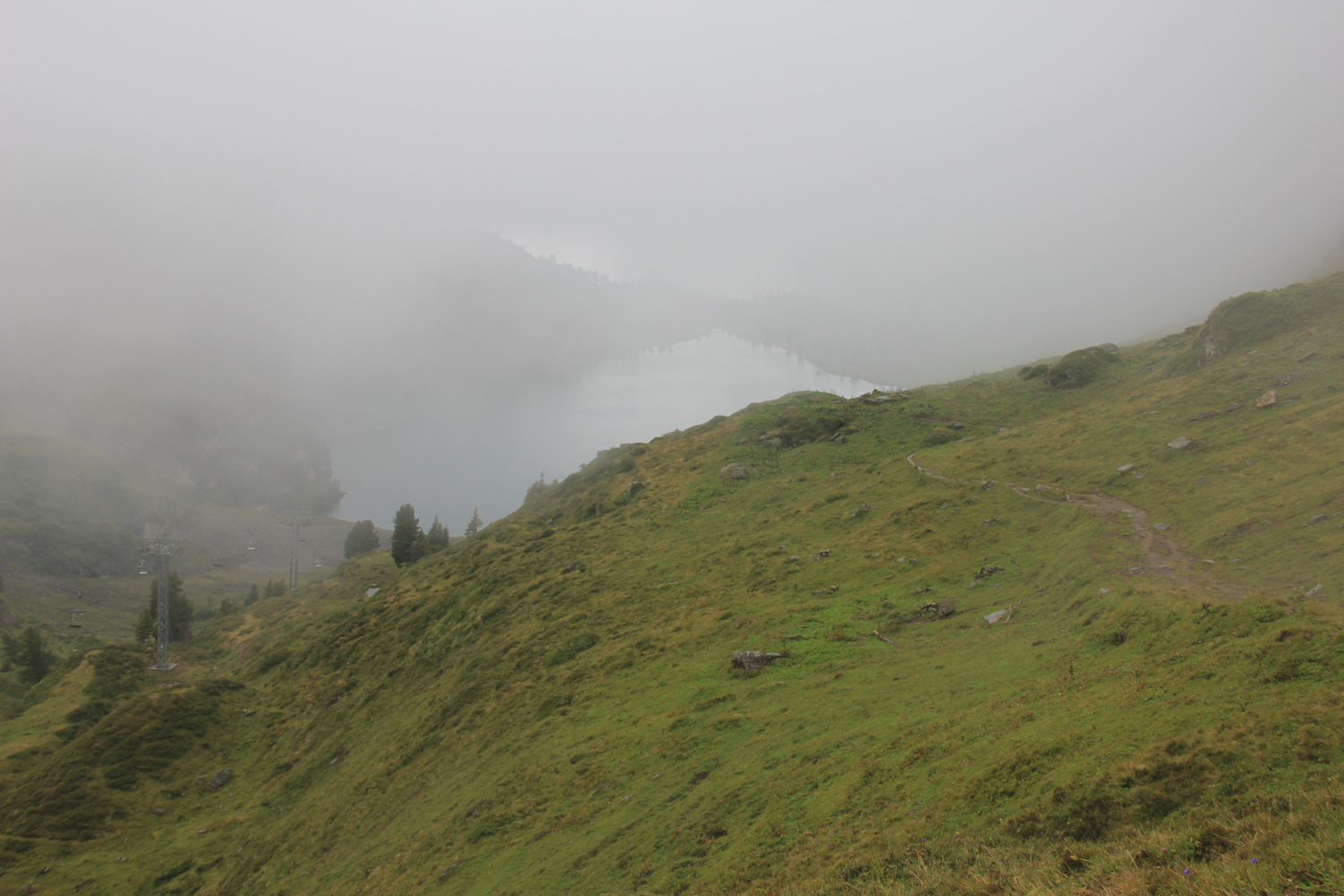 Bei bedecktem Himmel steige ich vom Bahnhof Engelberg auf einfachen Wegen zur Gerschnialp. Weiter geht es zur Seilbahnstation Trübsee. Im oberen Teil ist dieser Abschnitt ziemlich steil. Dummerweise ist hier der Weg gesperrt, sodass ich mehr oder wenig weglos aufsteigen muss, was einige Mühe bereitet. Inzwischen stecke ich in den Wolken. Den Trübsee bekomme ich nur deswegen zu Gesicht, weil der Weg direkt am Südufer entlanggeht. Etwa 450 Höhenmeter absolviere ich bis zum höchsten Punkt der Tagestour, dem Jochpass.