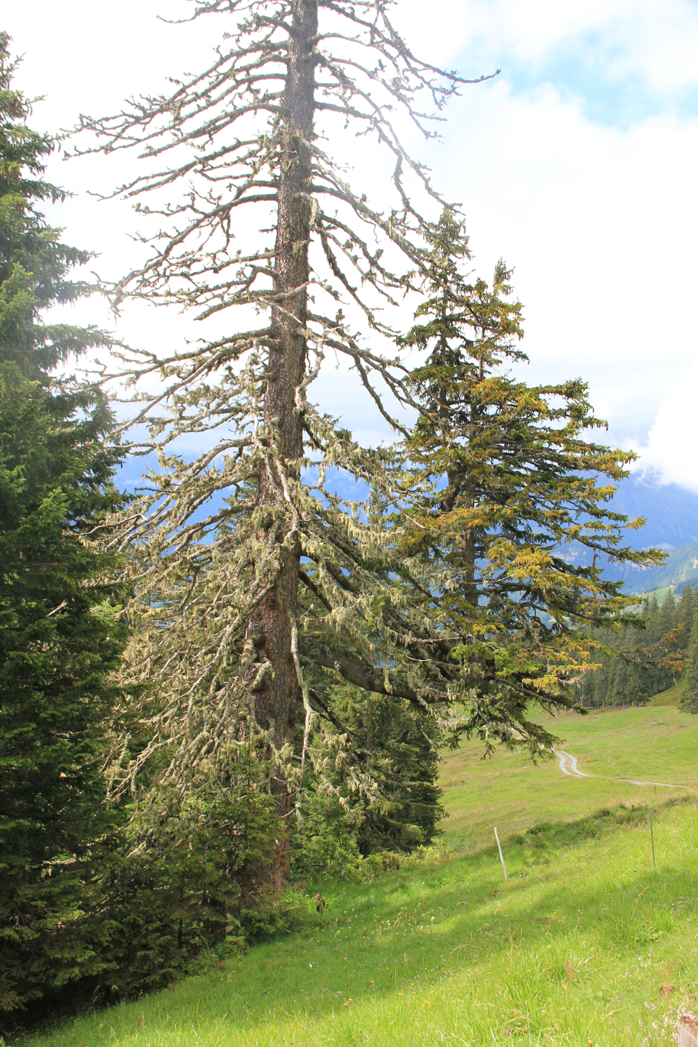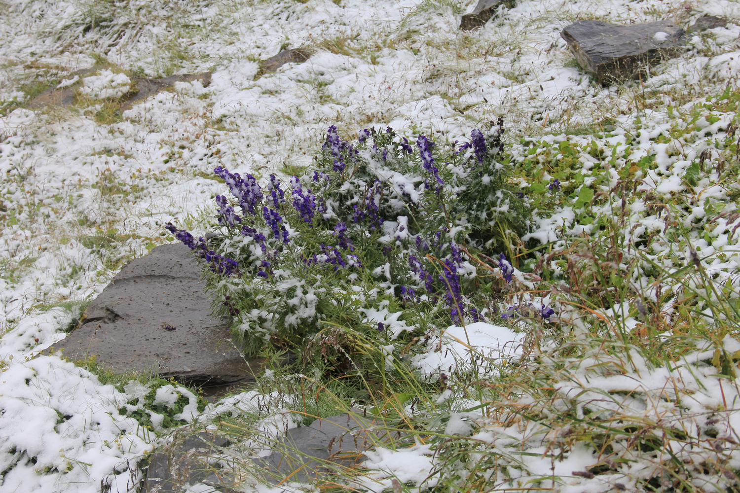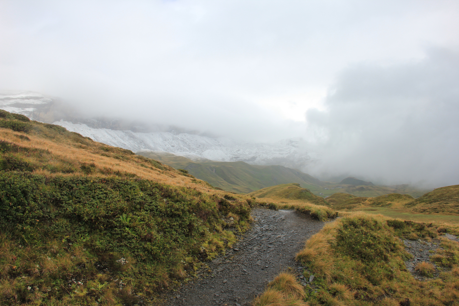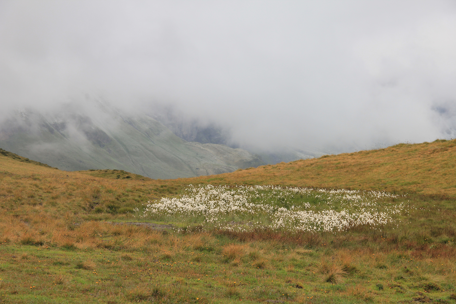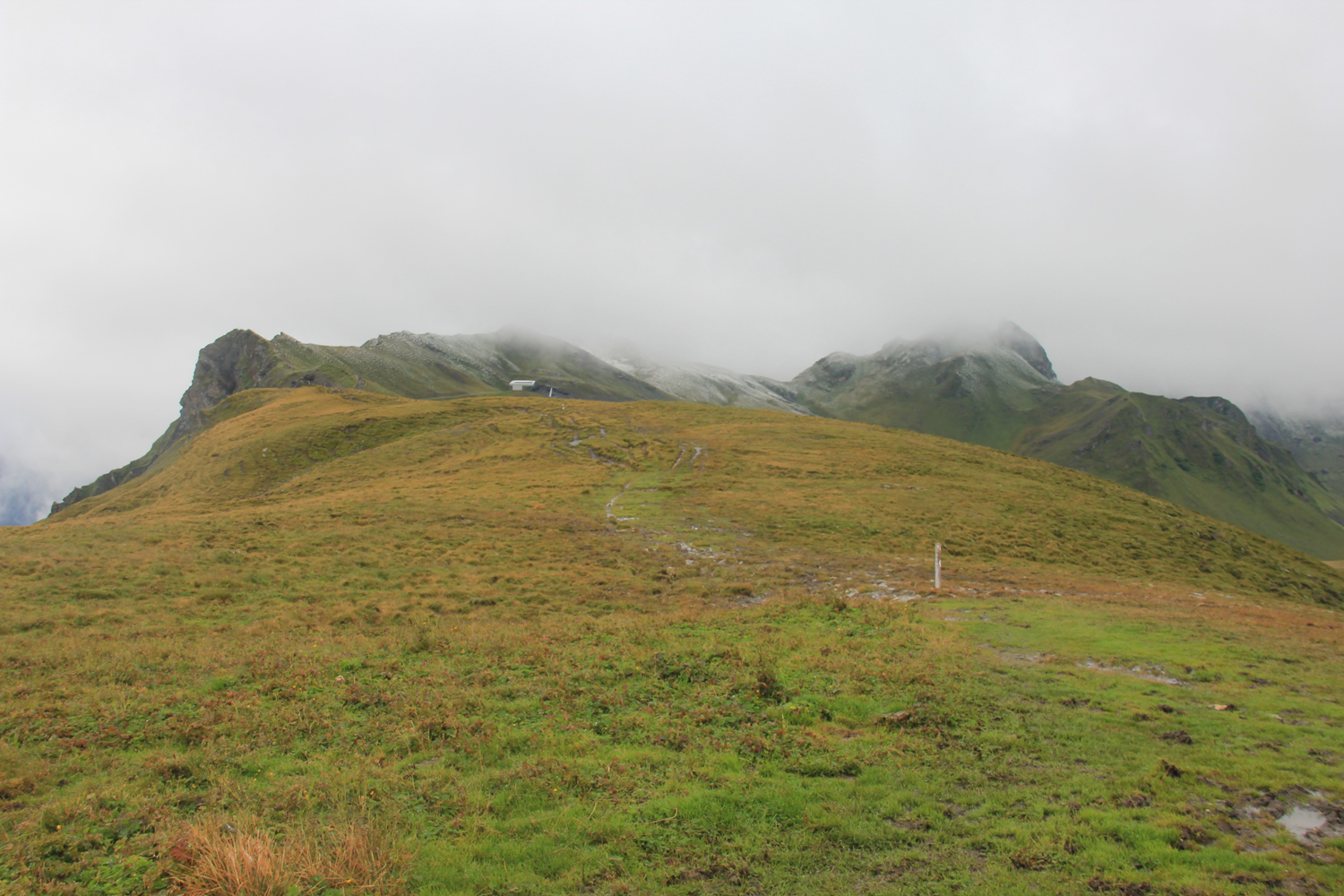Auf einem bequemen, sanft ansteigenden Weg geht es zur Tannalp und zum Tannensee, der bei schönerem Wetter sicher mehr Besuch erhält als heute. Weiter oben ist das Gras ein wenig mit Schnee überzuckert. Vom Kamm zum Balmeregghorn ist nur der untere Teil zu sehen, da die Wolkenuntergrenze etwa bei 2200 m liegt. Die Orientierung macht allerdings auch bei den heutigen Sichtverhältnissen keine Probleme.