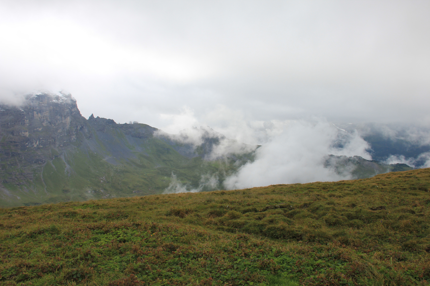 Am Gipfel des Balmeregghorns verlässt der Weg den Kamm und quert die Südostflanke des Rothorns, von dem aufgrund der Wolken nichts zu sehen ist. Ich werde mehrere Male von zwei Mountainbikern überholt, die ich im Verlauf der Querung trotz meines gemächlichen Tempos immer wieder einhole, da einer von ihnen mit technischen Problemen seines Rades zu kämpfen hat. Als ich an der Seilbahnstation Planplatten ankomme, stelle ich erfreut fest, dass sich das Wetter in den letzten drei Stunden deutlich gebessert hat.