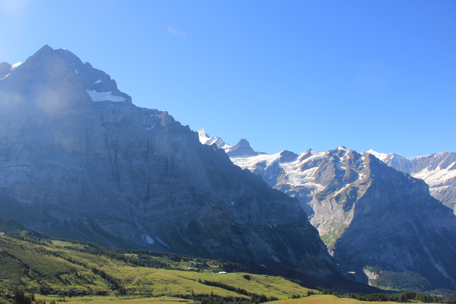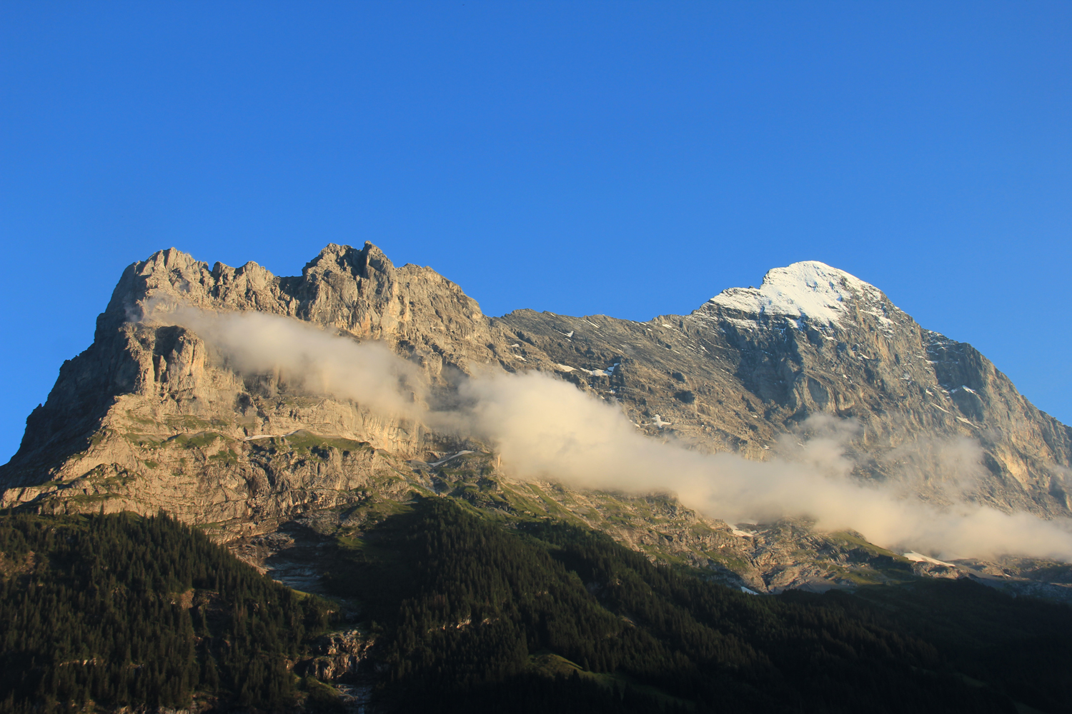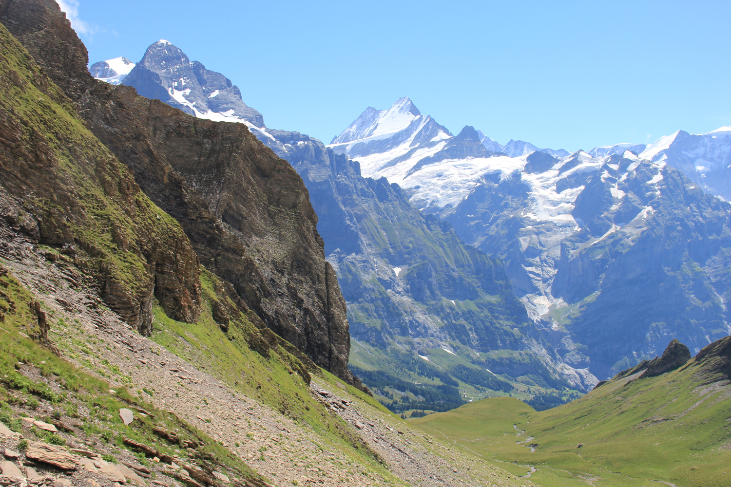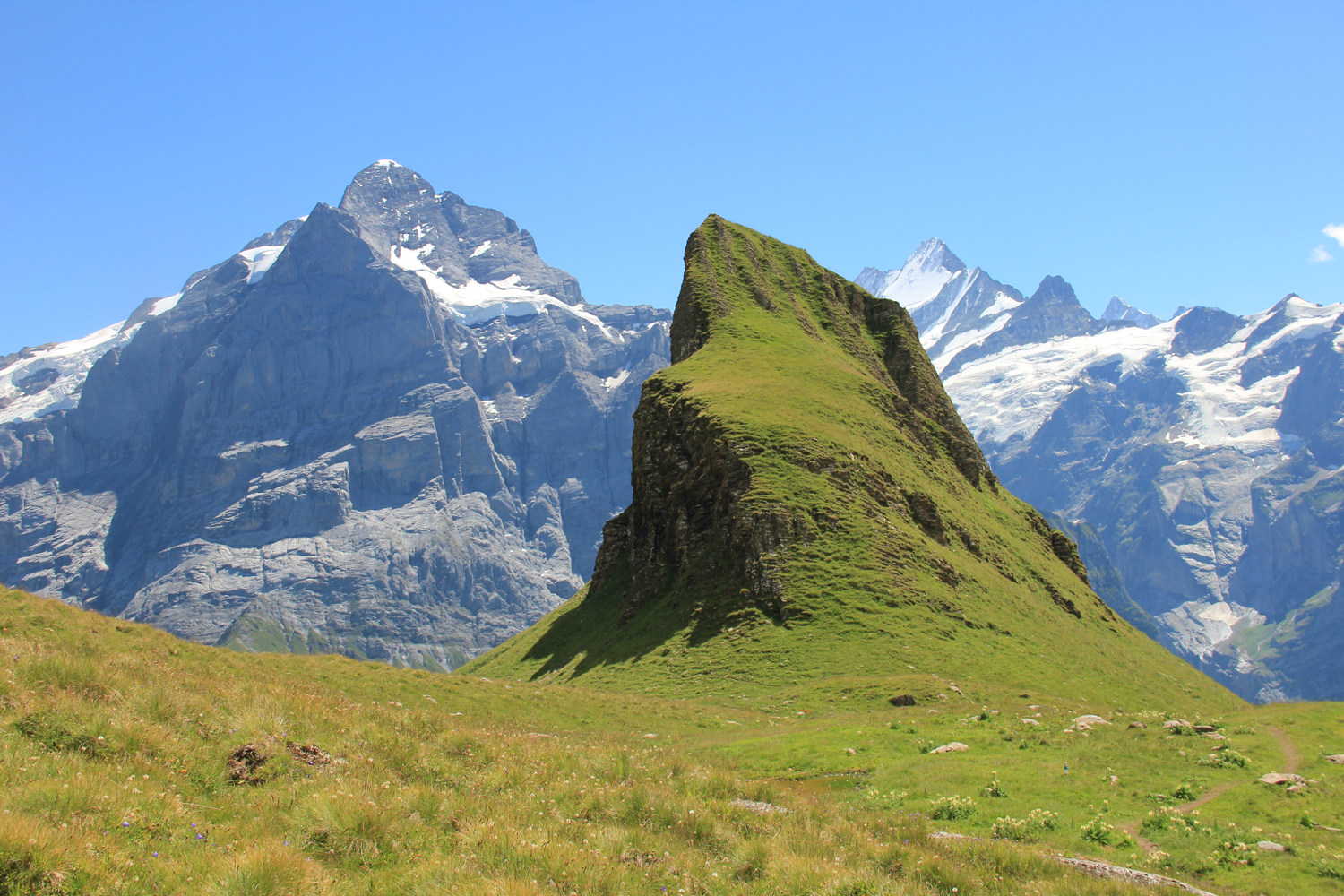 Die Aussicht am Gipfel ist überwältigend. Die großen Gipfel der Berner Alpen, Wetterhorn, Eiger, Finsteraarhorn, Lauteraarhorn, Schreckhorn und viele andere, sind beeindruckend. Klar, dass meine Gipfelpause ziemlich umfangreich ausfällt! Der Abstieg zur Grossen Scheidegg erfolgt auf dem gleichen Weg. Dadurch, dass die großen Berge jetzt vor mir liegen, ist der Genuss noch größer als im Aufstieg. Ähnlich wie im letzten Jahr sind gegenüber in der Wetterhorn-Nordwand wieder kleine Schneelawinen zu beobachten, aus sicherer Entfernung, versteht sich.