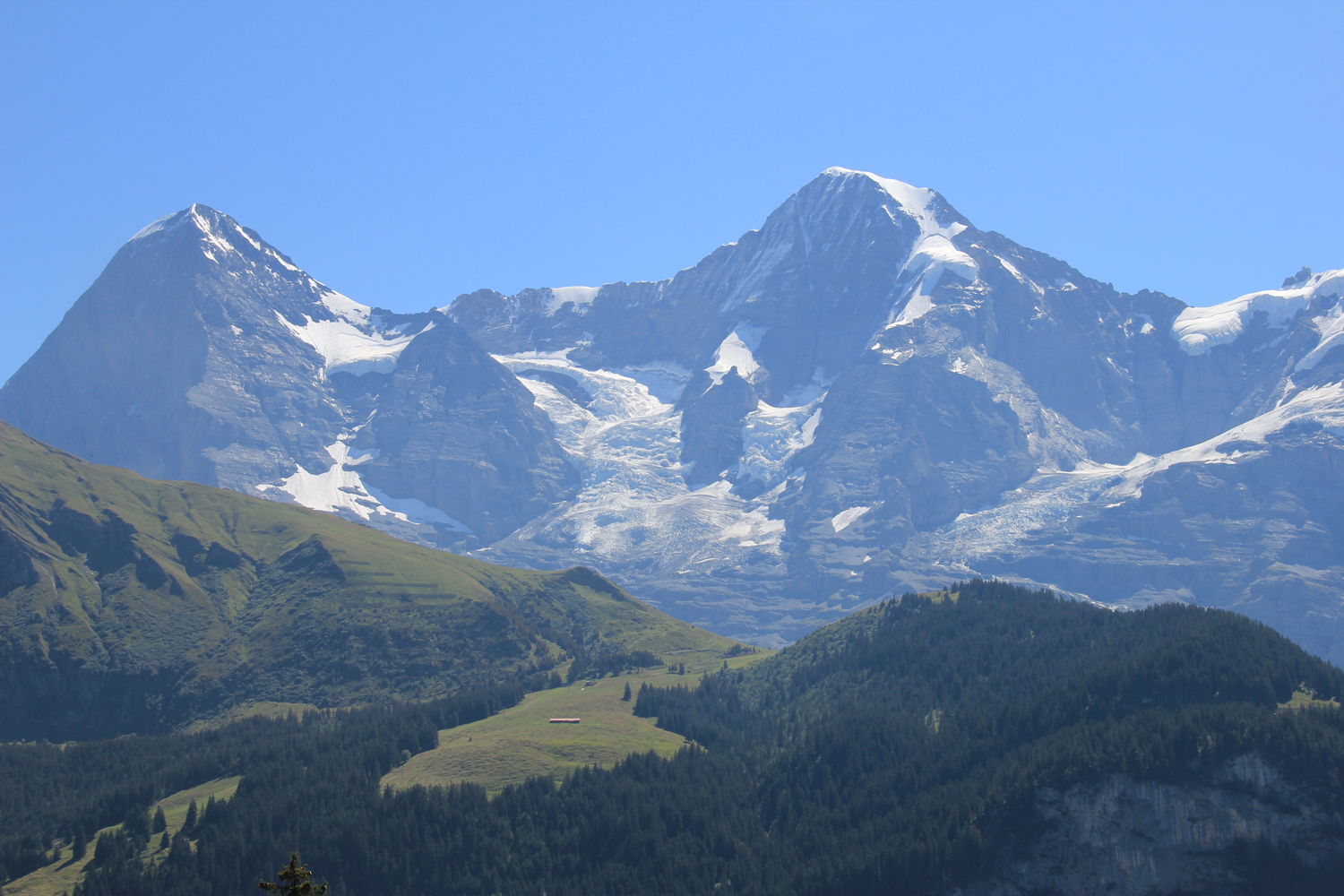 Erst nachdem ich den Ort hinter mir gelassen habe, wird es merklich ruhiger. Auf einem stellenweise richtig idyllischen Weg – mit Ausblicken auf die berühmten Drei (Eiger, Mönch, Jungfrau) – geht es weiter zur Alphütte Spilboden. Ein steiler Zwischenaufstieg bringt mich zum höchsten Punkt des Tages (etwa 2100 m), bevor in sanftem Abstieg mein Tagesziel, die Rotstockhütte, erreicht ist.