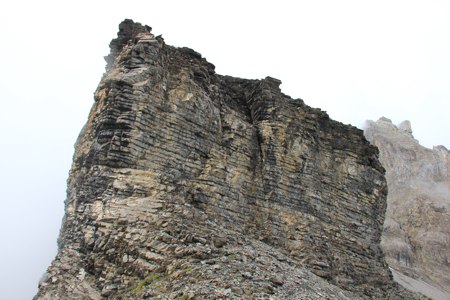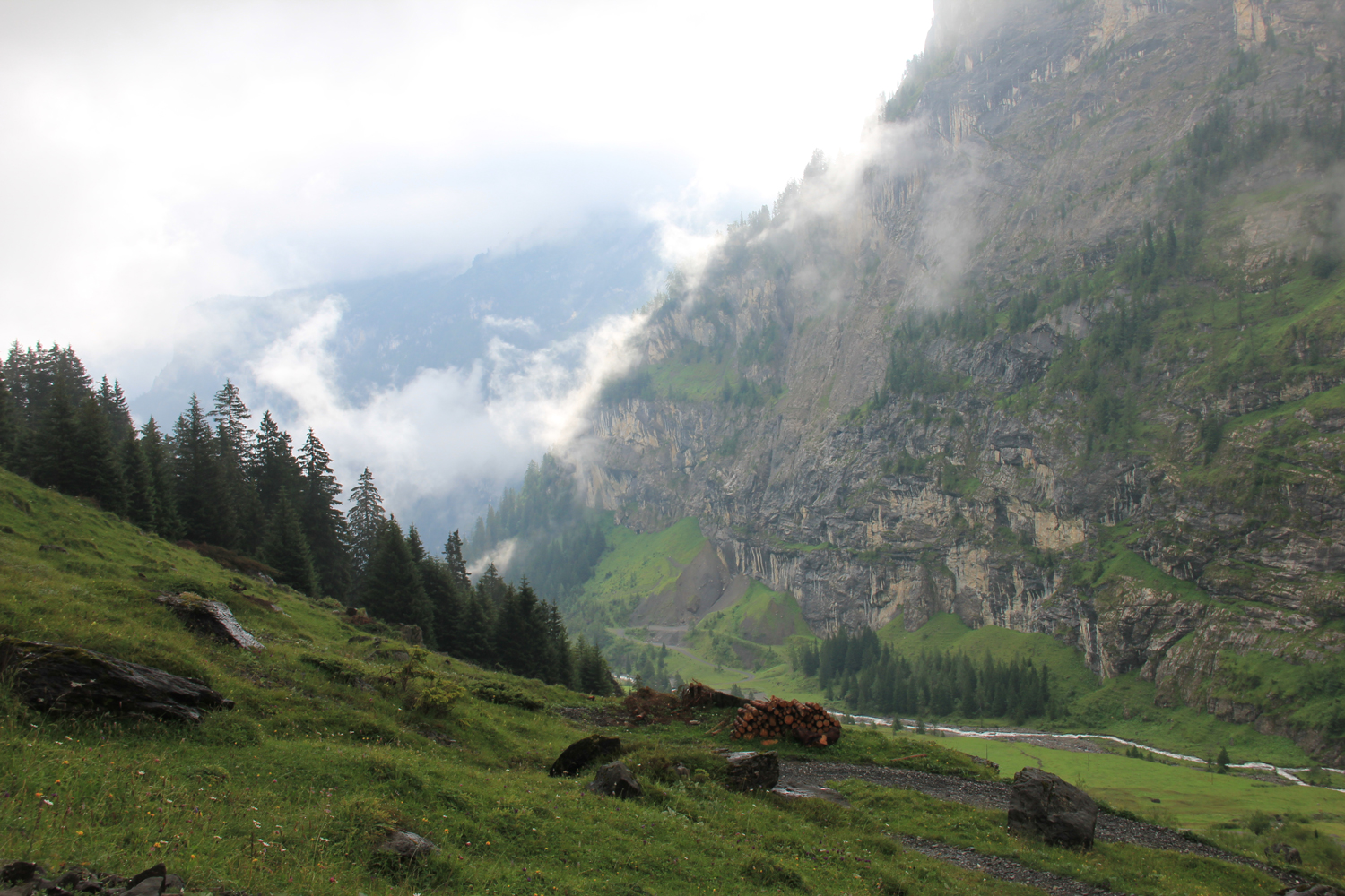 Vom Bahnhof Kandersteg geht es zuerst fast waagrecht auf der Westseite der Kander nach Eggenschwand. Hier beginnt ein netter Weg entlang des stellenweise recht wilden Alpbachs. Nach der Alpe Usser Üschene wird es steiler. Über Grashänge und einen kleinen Felsriegel erreiche ich schließlich den Sattel der Bunderchrinde. Es ist ziemlich neblig, aber inzwischen zumindest trocken.