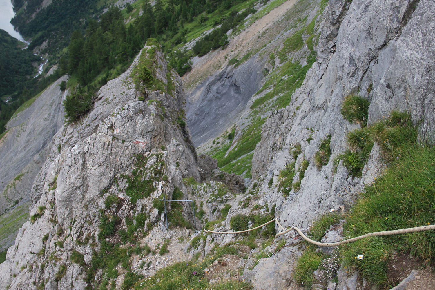 Nach der Passhöhe, die zugleich Sprachgrenze ist, geht es etwa 150 Höhenmeter parallel zur Straße abwärts, bis bei Tsanfleuron ein Weg nach Westen abzweigt. Beschilderung und Markierungen sind hier etwas spärlich, sodass ich ein wenig Probleme mit der Orientierung bekomme. Der Gesamtverlauf entlang des ausgetrockneten Bachs ist allerdings klar; allmählich gewinnt der Weg wieder an Höhe. In der Nähe des Sex Rouge folge ich der Abzweigung nach Süden. Ein wenig einfache Kletterei, ein paar Karrenfelder, dann bin ich am höchsten Punkt der Tagesetappe (etwa 2300 m) angekommen, wo die Abstiegsroute gut zu überblicken ist.