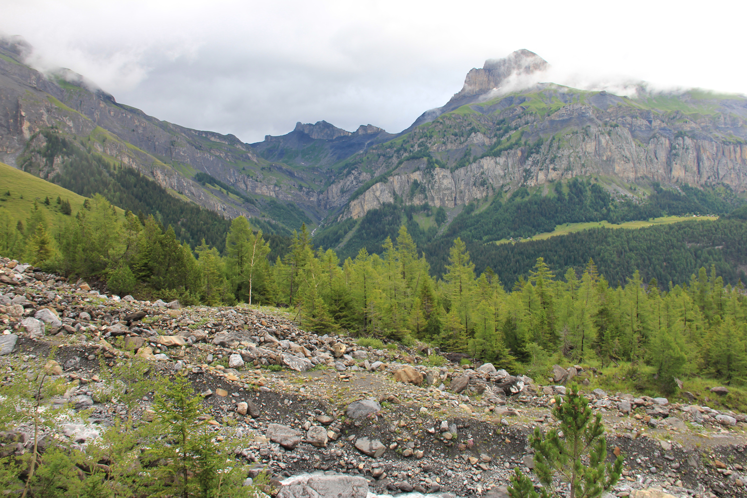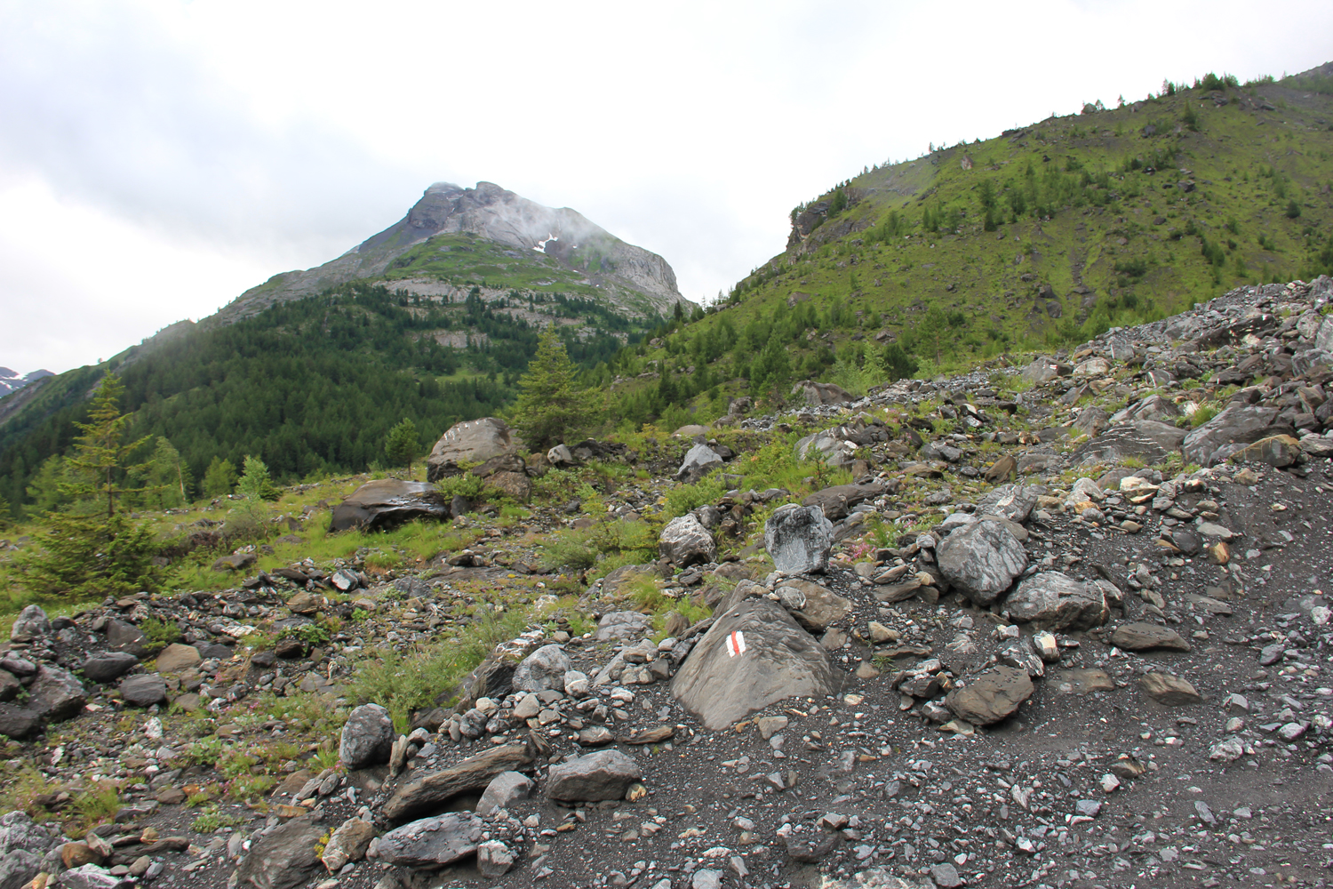 Von Le Godé, wo ich übernachtet habe, wandere ich auf dem Fahrweg hinüber zum Lac de Derborence. Dieser See entstand im Jahre 1749 durch einen riesigen Felssturz. Hier zweigt rechts ein Steig ab, der den Aufstieg ins Tal des Chevillence-Bachs ermöglicht. Nach der Brücke über den Bach folgt ein steilerer Wegabschnitt, bevor der Pas de Cheville erreicht ist. Es schließt sich eine weite, flache Hochebene an. In westlicher Richtung marschiere ich zu den Häusern von Anzeindaz. Nur zu gerne nutze ich die Einkehrmöglichkeit im Refuge und die damit verbundene Unterbrechung der Regenwanderung.