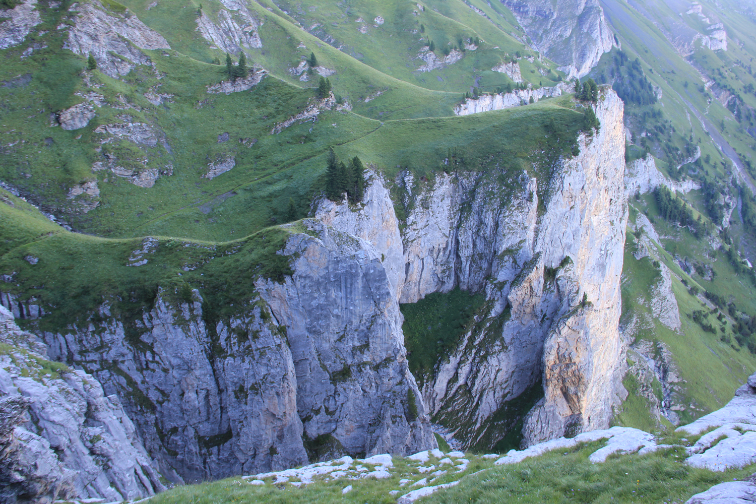 Bald taucht der Weg in den Wald ein, in vielen Kehren, vorbei an den Häusern von Jeur Brûlée, geht es hinab. Meinen ursprünglichen Plan, entsprechend der Wegführung der Via Alpina (Roter Weg) über Champex nach Vernayaz abzusteigen, gebe ich allerdings auf. Zum einen habe ich einem WWW-Beitrag entnommen, dass dieser Abstieg nicht ganz unproblematisch sein soll, zum anderen lassen die fehlenden beziehungsweise unklaren Wegweiser Zweifel an dieser Wegvariante aufkommen. Im Dorf Branson ist der lange Abstieg geschafft. Was noch fehlt, ist der abschließende (nicht sehr attraktive) Talhatscher zum Bahnhof von Martigny.