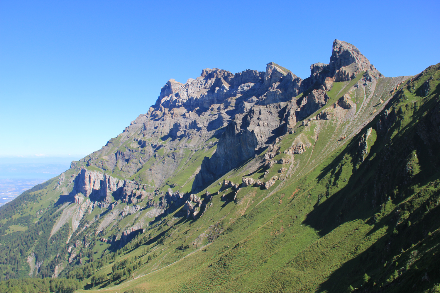 Ein wunderbarer Tag, gerade recht für so eine aussichtsreiche Tour! Gestern, bei meiner Ankunft an der Cabane de la Tourche, waren die Berge zum größten Teil in Wolken versteckt; erst kurz vor Sonnenuntergang ließ sich für einige Momente der Mont Blanc blicken. Jetzt, am Morgen, ist die Aussicht fantastisch. Von der Hütte quere ich hinüber zum Absatz Rionda, wo man die Wahl hat zwischen zwei Wegen zum Col du Demècre. Beim einen Weg (rechts) verliert man rund 500 Höhenmeter, bevor man über das Chalet Neuf zum Pass aufsteigt; nach den Informationen, die mir vorliegen, empfiehlt sich diese Variante bei schlechtem Wetter. Da die Verhältnisse heute wirklich gut sind, wähle ich den linken Weg, eine genussreiche Querung unter der Dent de Morcles, bei der man fast immer die Berge der Mont-Blanc-Gruppe vor Augen hat. Ein wenig Trittsicherheit ist hier angebracht, aber wirklich schwierig wird es nie. Der Col du Demècre mit der gleichnamigen Hütte (zum Zeitpunkt meiner Tour im Umbau) ist der höchste Punkt für heute.