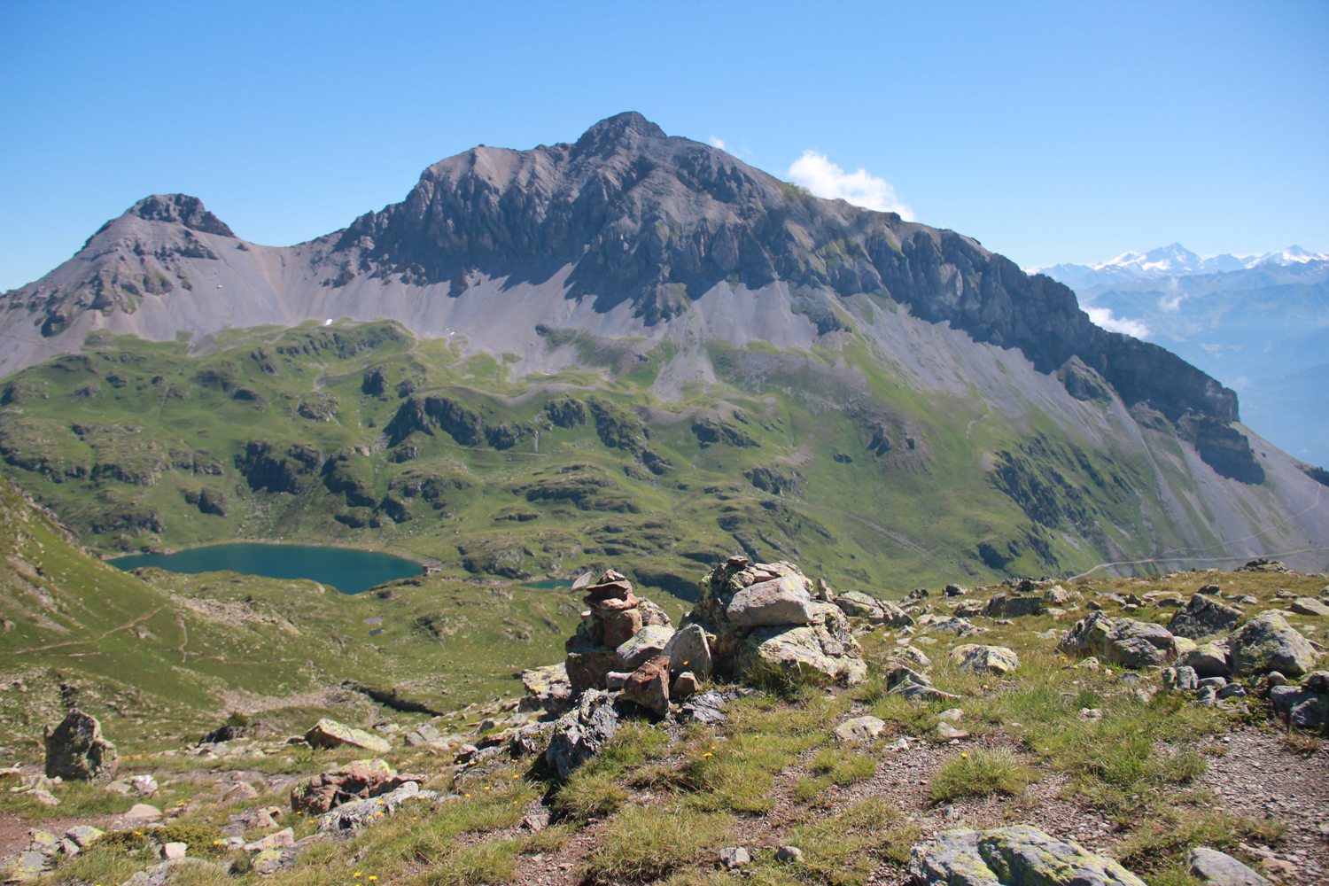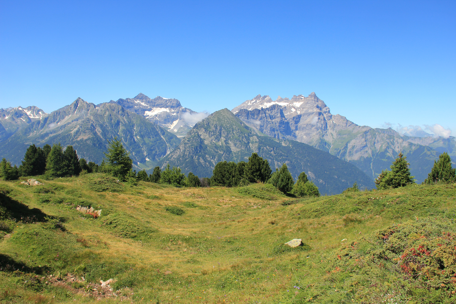 Die Fortsetzung der Wanderung erfolgt auf sehr bequemen, einfachen Wegen, zunächst auf der Westseite des grasigen Kamms, später am Kamm selbst. Vom Aussichtspunkt Sex Carro, der schöne Ausblicke auf Mont Blanc und Walliser Alpen bietet, sehe ich hinunter auf die Stadt Martigny. Es wird noch ein langer Abstieg ins Rhonetal!