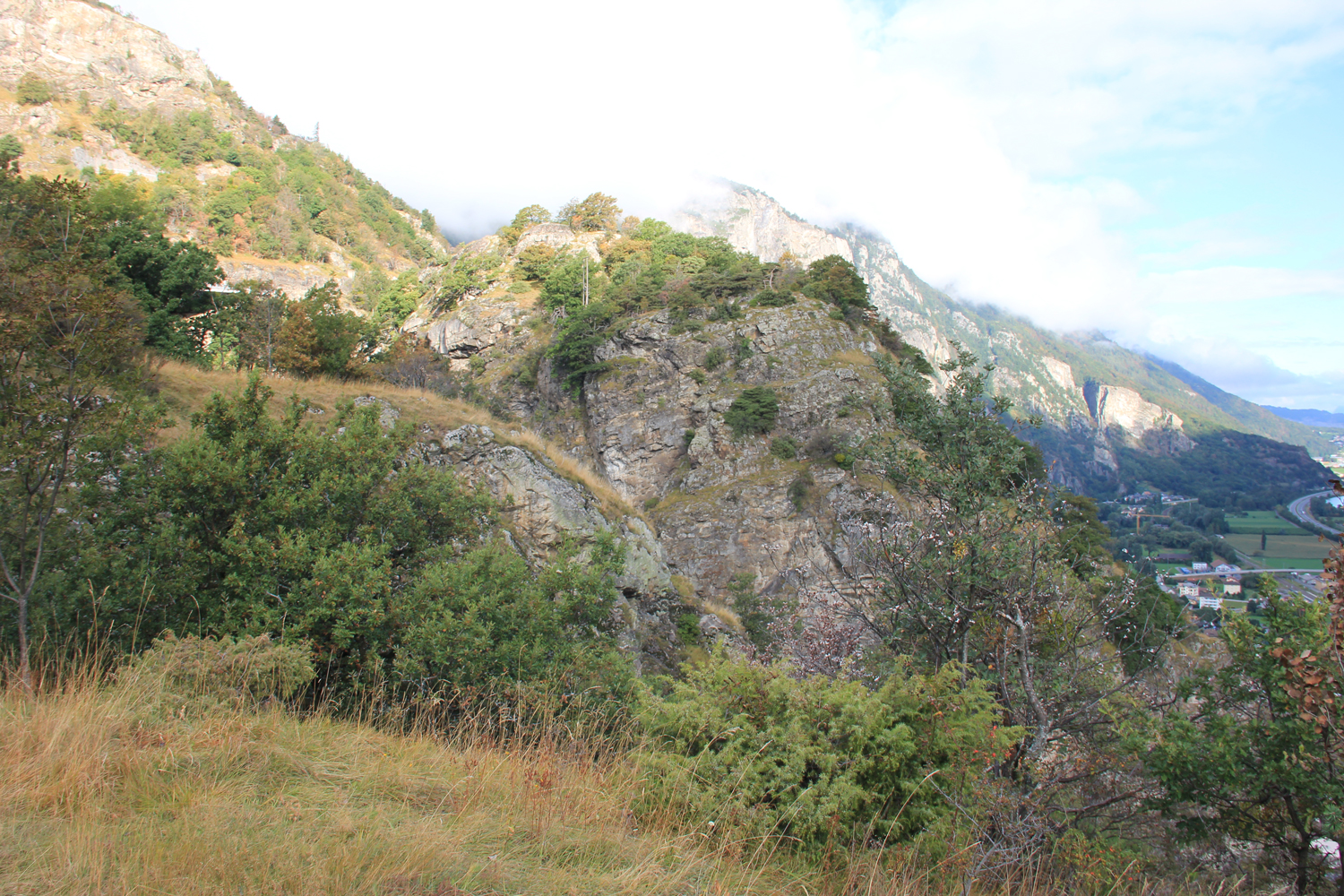 Schon gestern habe ich den Talspaziergang vom Hotel in Martigny nach Vernayaz absolviert. Heute nehme ich am Morgen den Zug nach Vernayaz, wo der Weg in einer gut begehbaren Schlucht beginnt. Bald wird das Gelände freier und bietet schöne Ausblicke auf das Rhonetal und auf die spektakuläre Brücke von Gueuroz. Am Ende dieses kleinen Dorfes zweigt links ein schmaler Weg ab, der zuerst am Kamm (gelegentlich sogar ein wenig ausgesetzt), dann rechts unterhalb des Kamms zu den Häusern von Charavex führt. Hier biege ich erneut nach links ab, um über einen Waldpfad und einen kleinen Sattel (Le Coeur) auf die Südostseite des Bergkamms zu gelangen. Auf einem bequemen Wirtschaftsweg geht es weiter zur Alpe L'Arpille. Von hier führt ein einfacher Wanderpfad durch Wiesen und lichten Wald von Norden zum Gipfel des Mont de l'Arpille.