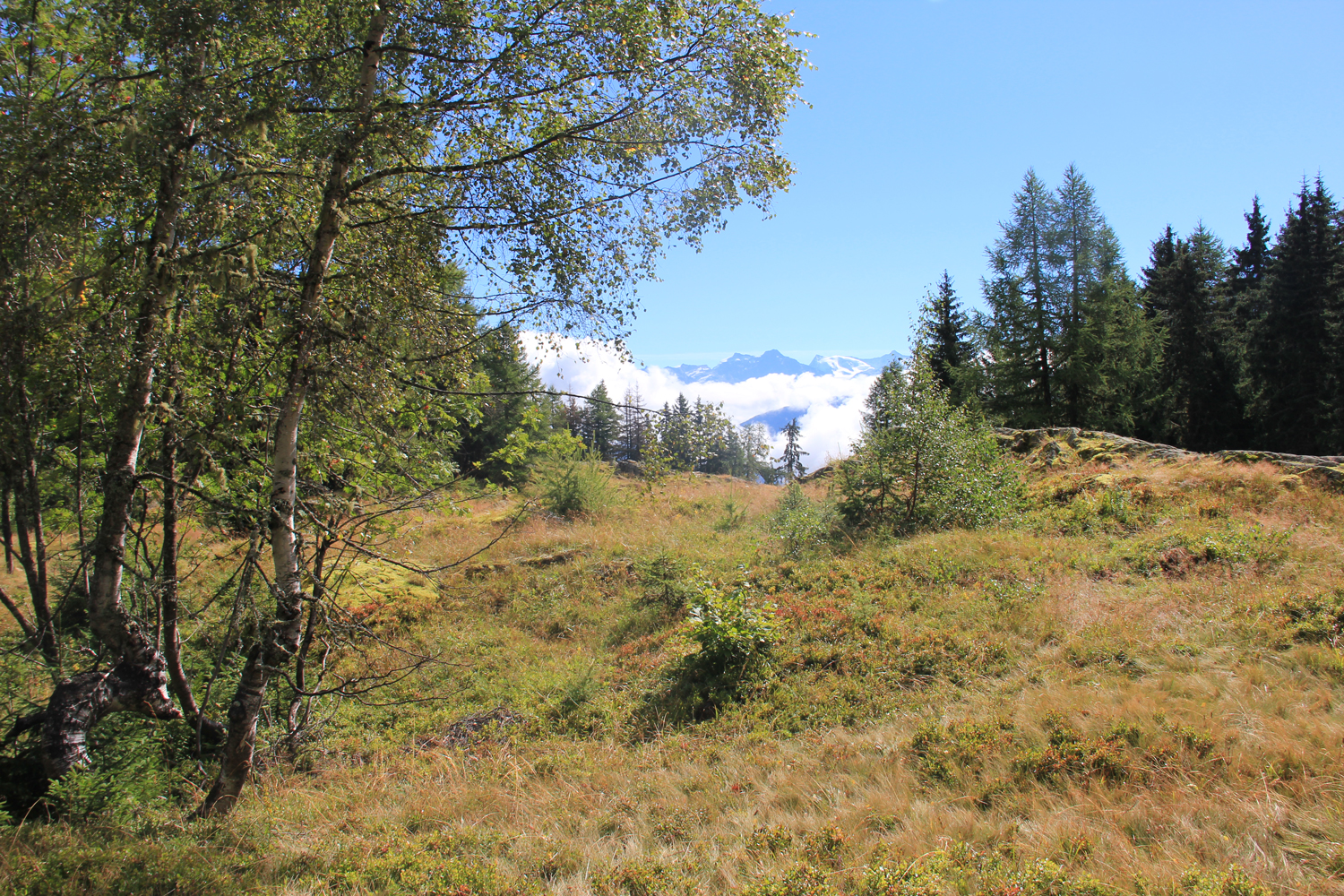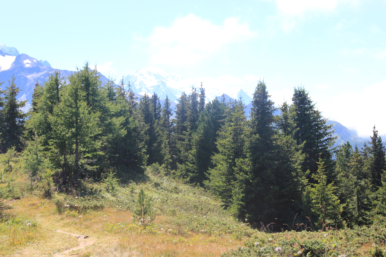 Nachdem ich während des gesamten Aufstiegs nur zwei weitere Bergwanderer getroffen habe, bin ich nicht mehr überrascht, auch auf dem Gipfel allein zu sein. Das Wetter ist ganz ordentlich, nur die Fernsicht ist durch Dunst etwas eingeschränkt, insbesondere in Richtung Mont Blanc. Nach längerer Gipfelpause steige ich auf einem relativ steilen Waldweg ab zum Col de la Forclaz, wo es eine Busverbindung nach Martigny gibt.