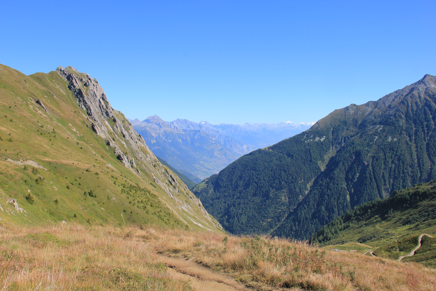 Im Rahmen meiner Ost-West-Durchquerung werde ich heute von der Schweiz nach Frankreich wandern. Der Postbus bringt mich von Martigny, wo ich übernachtet habe, wieder hinauf zum Col de la Forclaz. Von hier geht es zunächst im Wald gemächlich abwärts. Der tiefste Punkt des Weges ist Le Peuty, wo eine Brücke über den Trient-Bach führt. Auf der anderen Seite des Tals sind immerhin mehr als 800 Höhenmeter zu überwinden, zuerst im Wald, später in offenem Gelände. Bis zum Col de Balme begegnen mir nur wenige Bergwanderer, was sich allerdings am Pass schlagartig ändert. Plötzlich sehe ich den Mont Blanc in voller Pracht vor mir und gleichzeitig die Menschenmassen, die den Col de Balme bevölkern.