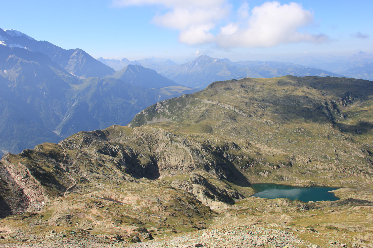 Der Abstieg in südlicher Richtung bietet Wandergenuss pur, immer mit dem Mont Blanc vor Augen. Immer wieder denke ich zurück an die Besteigung des Gipfels im Sommer 1988. Am Lac du Brévent vorbei, wandere ich zum Refuge de Bellachat, das sich für eine Pause anbietet. Der Schlussabstieg nach Les Houches zieht sich mit über 1100 Höhenmetern noch gehörig in die Länge, aber nach den tollen Eindrücken der letzten vier Tage nimmt man das gerne in Kauf.