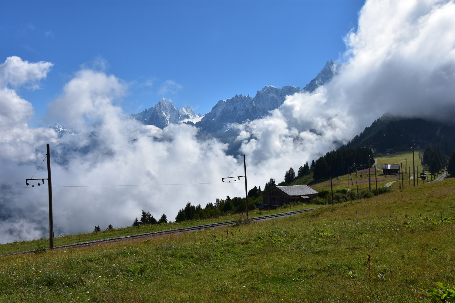 Der erste Teil der Etappe, der Aufstieg zum Col de Voza, ist nicht gerade spektakulär. Da macht es nichts aus, dass der Himmel noch wolkenverhangen ist. Als ich am Col de Voza, einem Haltepunkt des Tramway du Mont Blanc, ankomme, haben die Wolken erfreulicherweise den Blick auf die Aiguille de Bionnassay freigegeben.
