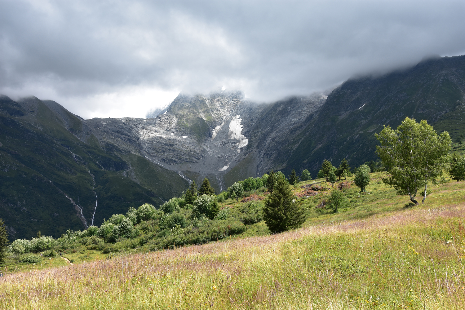 Auf der anderen Seite des Passes geht der Weg relativ steil hinunter zu den Chalets de Miage, wo es eine hoch willkommene Einkehrmöglichkeit gibt. Im letzten Teil der Tagesetappe fordert ein Gegenaufstieg von knapp 200 Höhenmetern, der zu einem kleinen Sattel bei den Chalets du Truc führt, nochmal einige Schweißtropfen. Von hier bringt mich ein einfacher und bequemer Abstiegsweg hinunter nach Les Contamines-Montjoie.