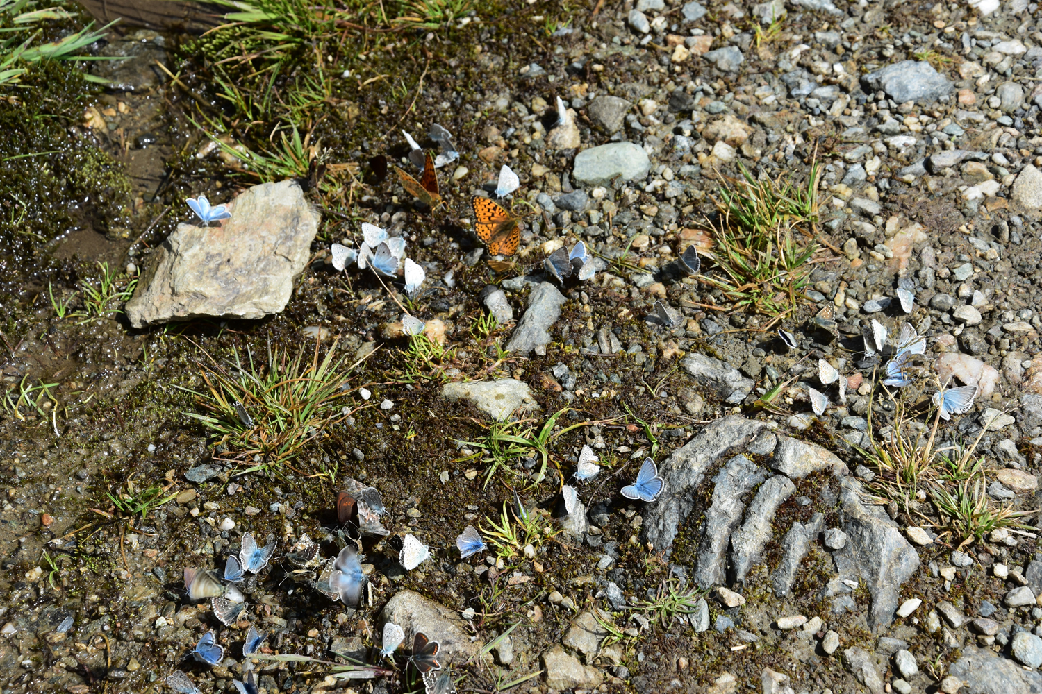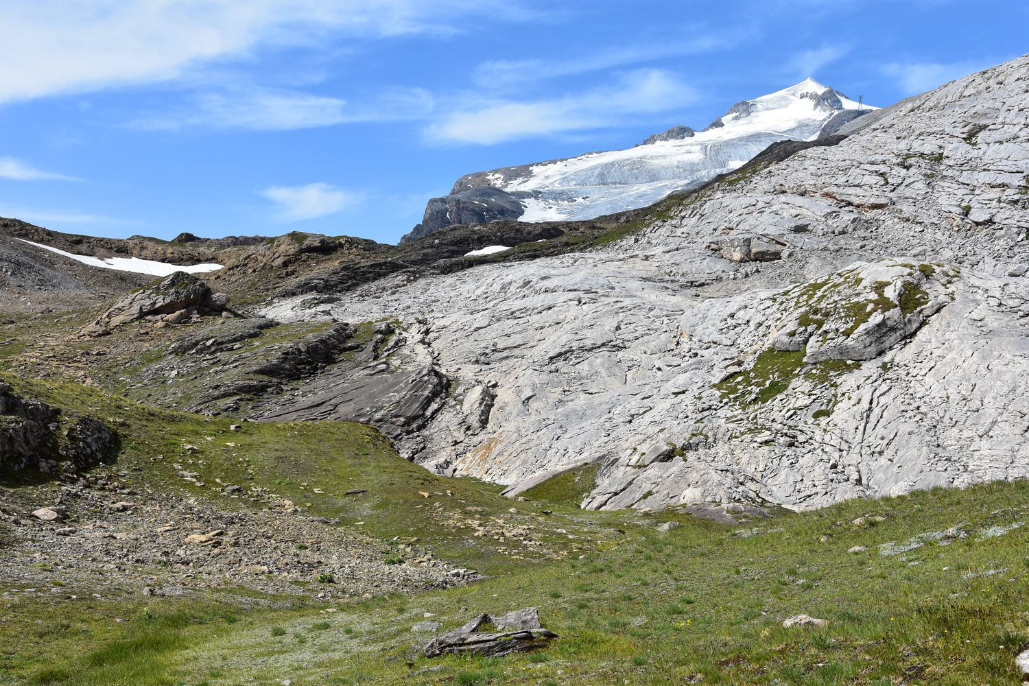 Ein Abstieg von rund 500 Höhenmetern über sommerliche Skipisten bringt mich nach Val Claret. Hier verlasse ich den GR 5; die nächsten drei Tage werde ich auf dem GR 55 unterwegs sein. Der anschließende Wiederaufstieg verläuft zunächst parallel zu einem Sessellift; erst ab etwa 2500 m Höhe kann man wieder richtig die Natur genießen. Ein bequemer, flacher Wanderweg führt zum höchsten Punkt des heutigen Tages, dem Col de la Leisse. Eigentlich wäre hier eine längere Pause geplant gewesen, aber es bläst ein recht starker Wind, und geschützte Plätze gibt es in Passnähe wohl keine. Daher wandere ich noch ein gutes Stück in südwestlicher Richtung, bis ich die Mittagspause nachholen kann.