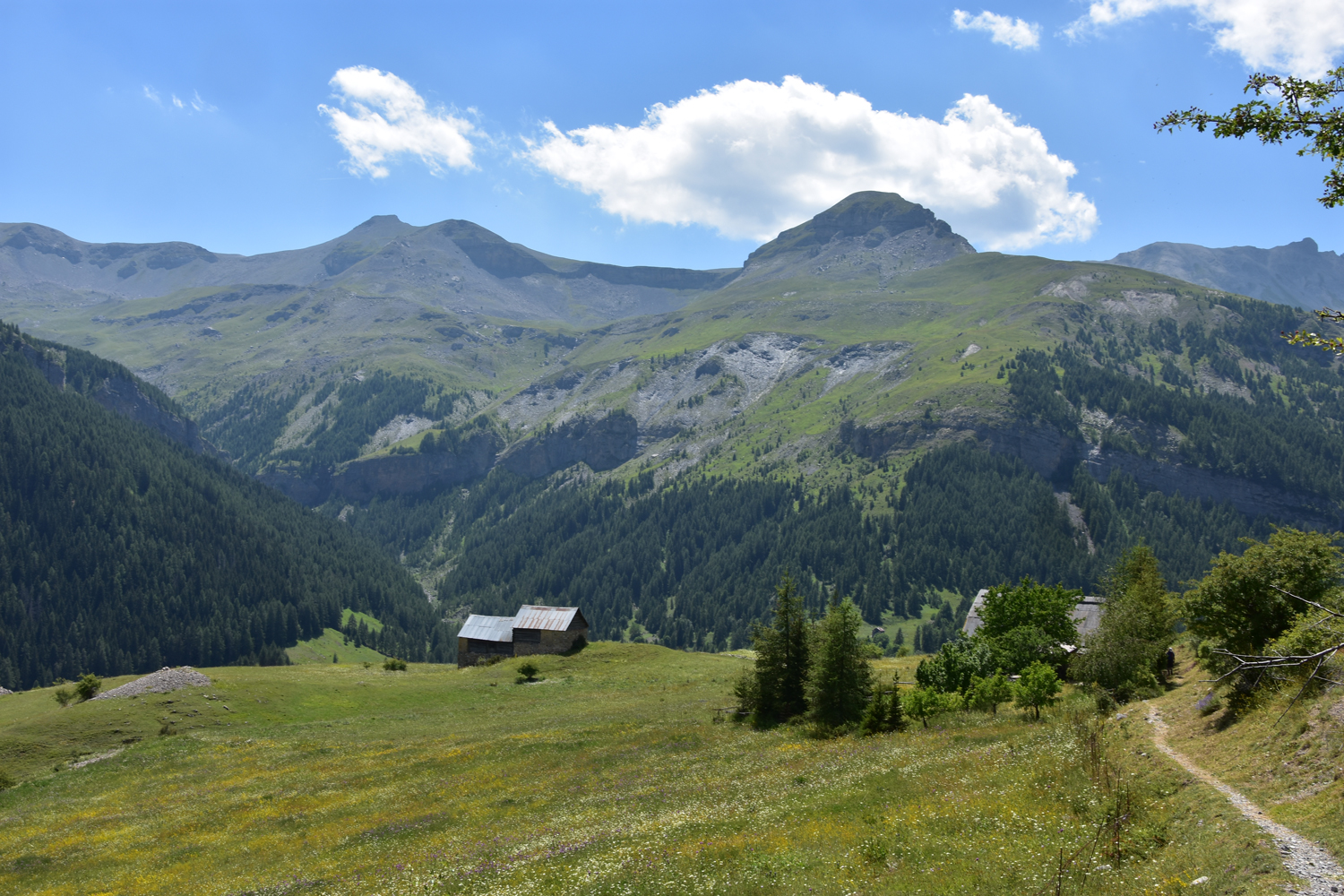 Der Abstieg vom Sattel geht im Wesentlichen durch freies Gelände. Der Blick nach Süden wird beherrscht vom Mont Mounier, der morgen auf dem Programm steht. Endpunkt der heutigen Etappe ist die Häusergruppe Roya im gleichnamigen Tal.