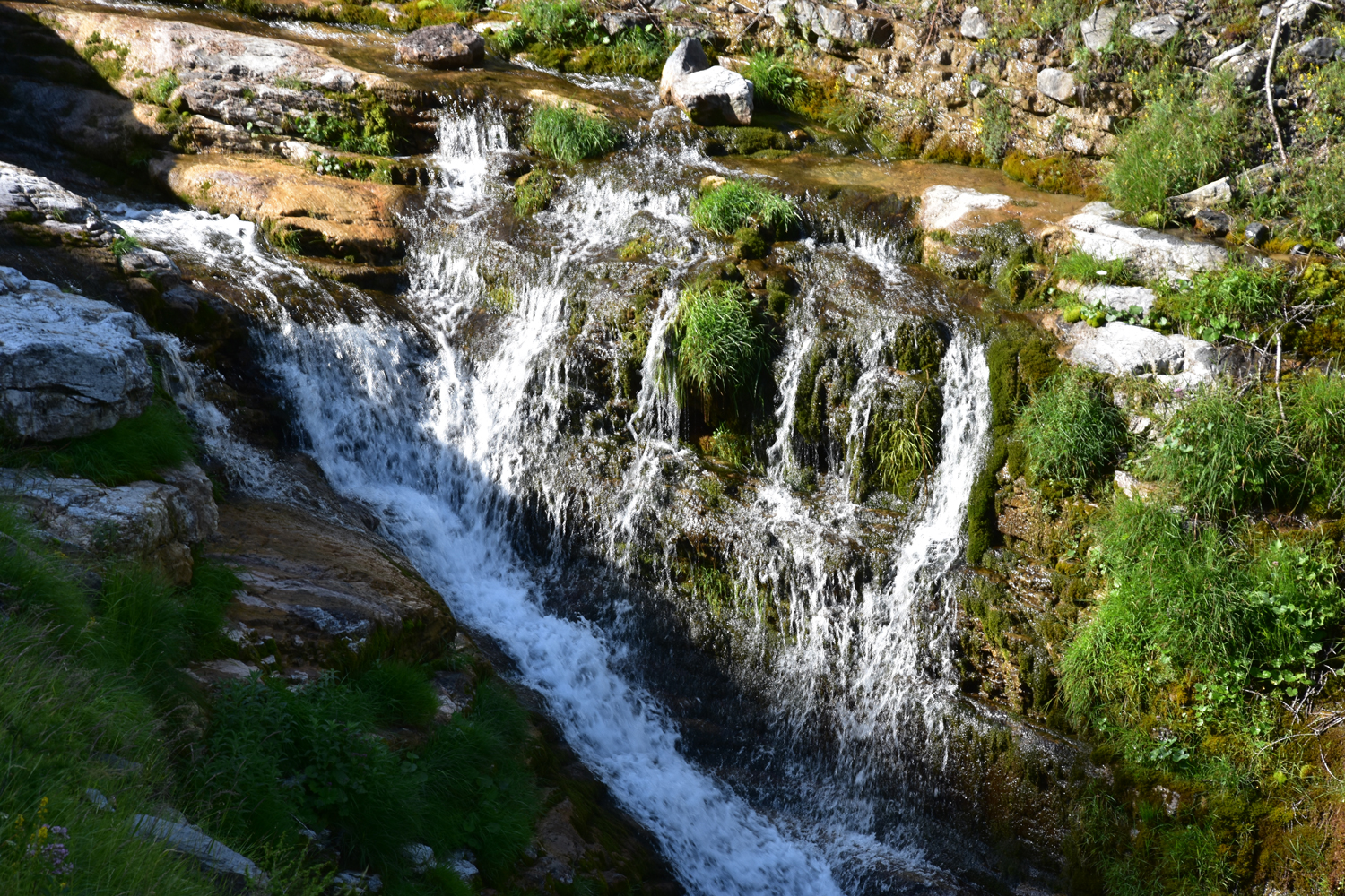Über eine weite Hochfläche gelange ich zum grasigen Col des Moulinés. Der Regen hat inzwischen wieder aufgehört. Der Weiterweg zieht sich allerdings noch gewaltig. Nach einer langen Querung von Grashängen geht es am Rande einer Schlucht wieder aufwärts zu den Portes de Longon. Erneut setzt Regen ein. Über weite Almwiesen erreiche ich schließlich mein Tagesziel, das Refuge de Longon, eine Alm mit Übernachtungsmöglichkeit.