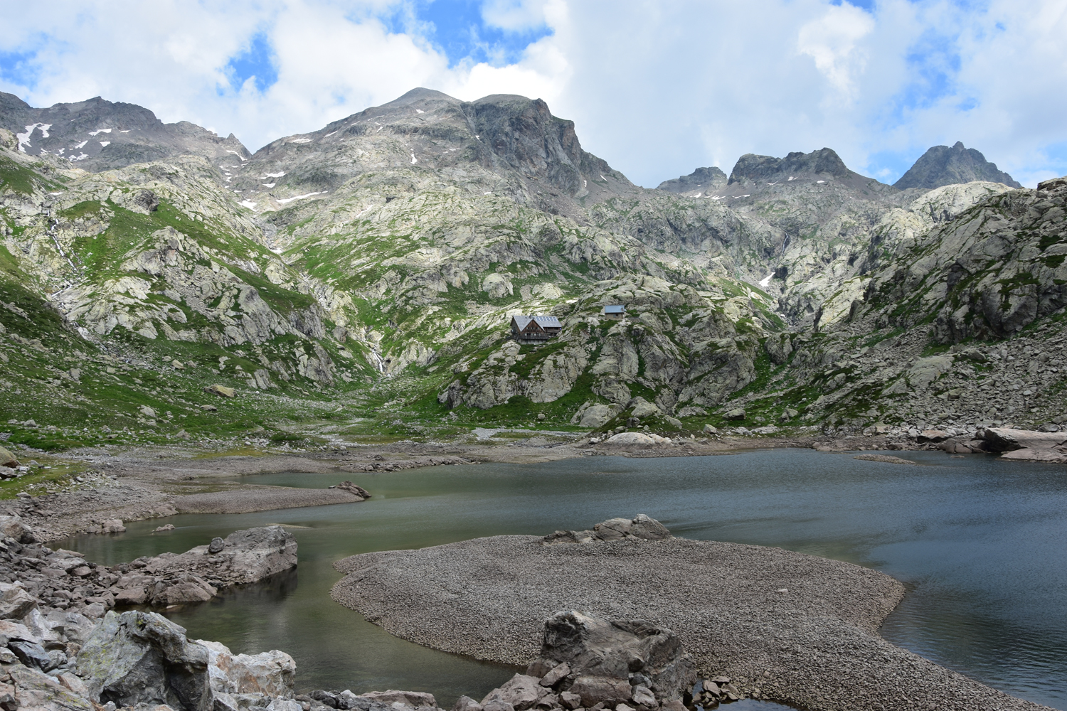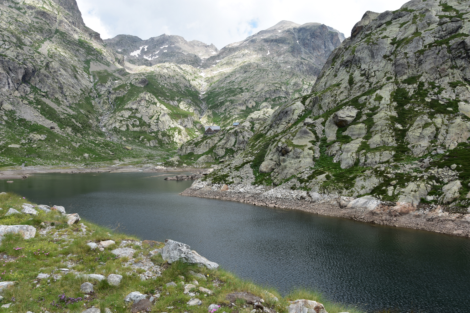 Auch beim Abstieg vom Pass nach Osten ist ein wenig Trittsicherheit angesagt, aber die Schwierigkeiten halten sich in Grenzen. Über Blockwerk geht es hinunter zum Bach unterhalb der Staumauer des Lac de la Fous. Diese Staumauer ist offensichtlich ein beliebter Steinbock-Spielplatz. Nach Ankunft am Refuge de Nice bietet sich nochmal eine Gelegenheit, die schönen Tiere zu beobachten. Nur wenige Meter von der Hütte entfernt kommt uns eine Steingeiß mit ihrem Jungen entgegen.