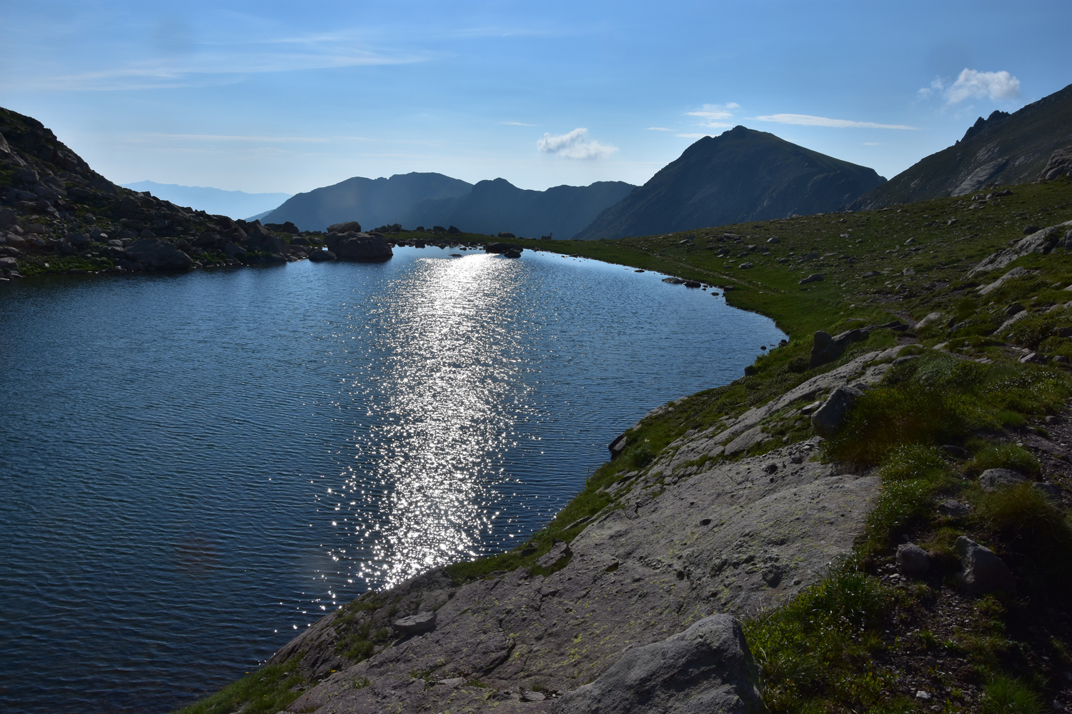 Wir starten bei schönstem Wetter am Refuge des Merveilles und wandern gemächlich durch die herrliche Seenlandschaft oberhalb der Hütte. Bei den Lacs du Diable deponieren wir die Rucksäcke und zweigen vom GR 52 ab, um noch einen Gipfel mitzunehmen. Die Cime du Diable, immerhin fast 2700 m hoch, lässt sich von hier auf gutem Weg erreichen. Vielleicht kann man vom Gipfel schon das Mittelmeer sehen! Diese Hoffnung erfüllt sich leider nicht, da es etwas zu dunstig dafür ist. Trotzdem: Der Aufstieg lohnt sich.