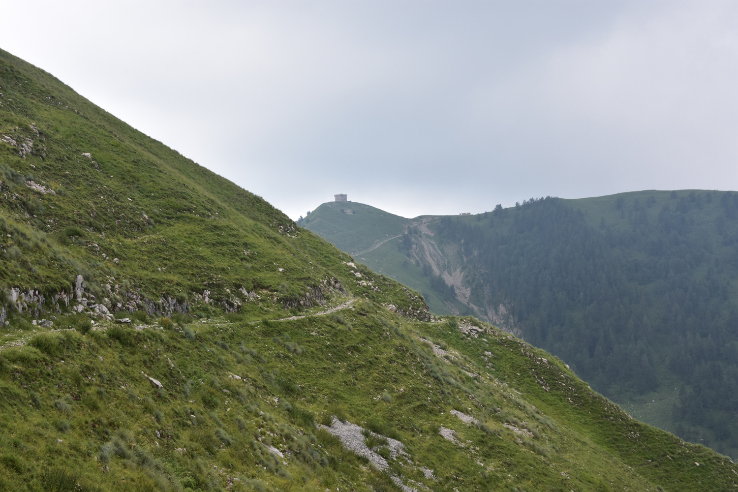 Bei bewölktem Himmel packen wir den Gegenaufstieg an, der uns zur markanten Festungsanlage "Pointe des Trois Communes" führt. Vielleicht wäre es besser gewesen, auf eine ausführliche Besichtigung der Anlage zu verzichten, denn ziemlich plötzlich beginnt es zu blitzen und zu donnern. Ungünstigerweise verläuft der Weg in diesem Bereich direkt am Kamm, was natürlich das Risiko eines Blitzeinschlags vergrößert; soweit möglich, versuchen wir den Kamm zu meiden. Zum Glück ist das Gewitter bald vorbei, dafür regnet es jetzt in Strömen. Unter dem Dach einer Hütte warten wir ab, bis der Regen nachlässt. Kurze Zeit später geht es wieder los, aber der Weg zum Camp d'Argent ist nicht mehr weit.