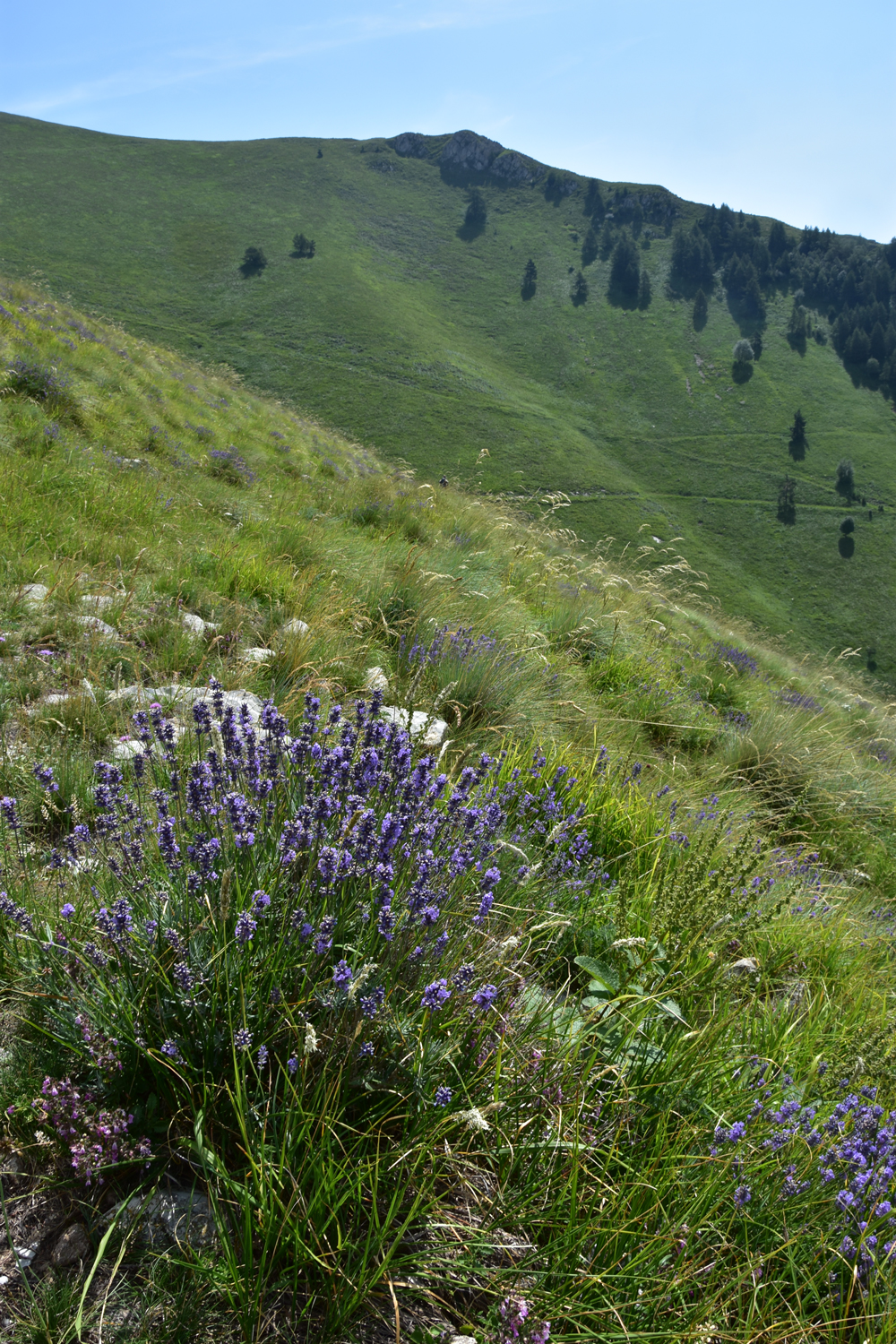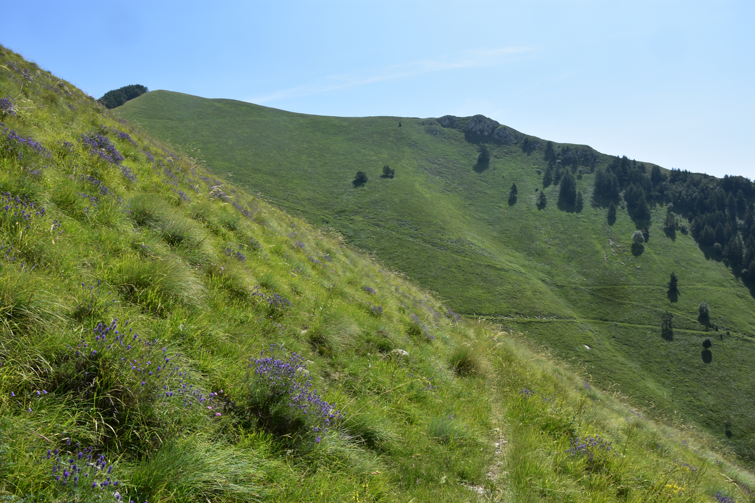 Beim Weiterweg haben wir Probleme mit der Orientierung. Das liegt wohl nicht nur an der fehlenden Beschilderung, sondern auch daran, dass unsere Karte nur den Maßstab 1 : 100 000 hat. (Bisher hat das allerdings immer ausgereicht.) Mit etwas Mühe finden wir den eingezeichneten Weg, der westlich des Kamms (also rechts) die Gras- und Waldhänge quert und hinüber zur Baisse de Linière führt. Anscheinend wird dieser Weg kaum mehr benützt und wächst allmählich zu. Es sieht so aus, als ob es eine neue Wegführung auf der Ostseite des Kamms gäbe.