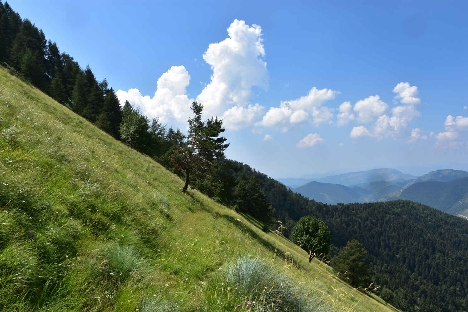 Wenige Meter nach dem Camp d'Argent zweigt ein schattiger Waldweg von der Straße nach links ab. In einer langen Querung, mal abwärts, mal aufwärts, wandern wir hinüber zu den Cabanes Vieilles, einer früheren militärischen Anlage. Hier wendet sich der Weg nach Süden, wobei nochmal eine Höhe von knapp 2000 m erreicht wird, bevor es zur Baisse de Ventabren und zur Baisse de la Déa hinuntergeht. Der Pass bietet sich an für eine kurze Pause.
